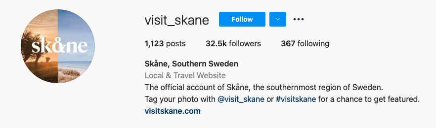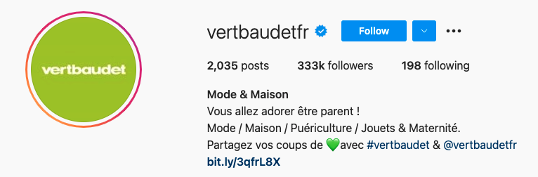 Make it easy for people to join your community with a UGC announcement on your Instagram, Facebook, Twitter, and Pinterest page bio. By giving your audience a concrete reason and a customized hashtag representing your brand, you not only encourage them to share their experience with you, but you also market yourself as a genuine brand that actually cares about your customers. Take a look at Swedish travel agency Visit Skåne (@visit_skane) and the largest European brand in children's fashion and care, Vertbaudet (@vertbaudetfr), and their announcements in their Instagram bios.