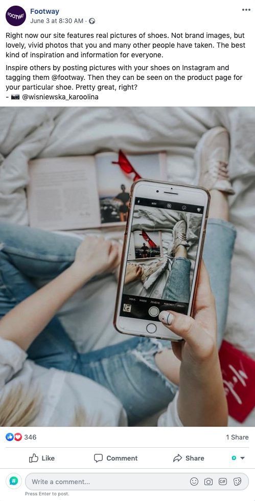 Another one of our client, Footway, a Swedish shoe retailer, has made the online community aware of their activation campaign and expanded their audience base by creating a Facebook post sharing this kind of message. Customers are always excited to post an image of themself with their brand new shoes.