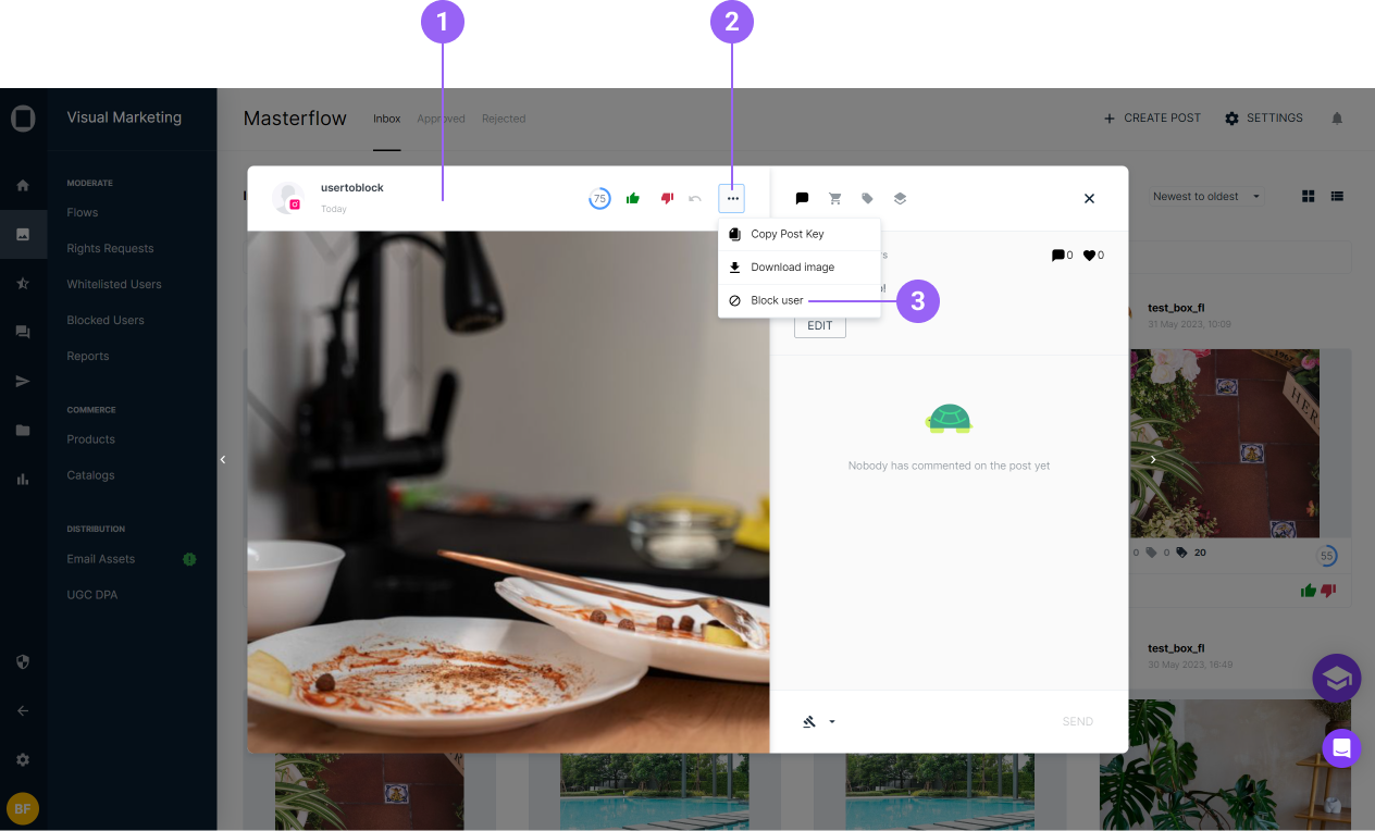 When a new post appears in your inbox from a user you wish to block for future content, you can efficiently block the user directly from the post moderation window.