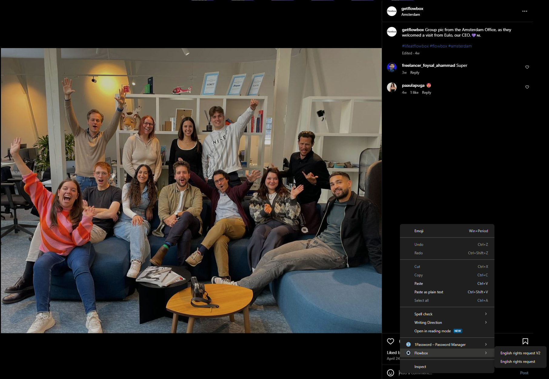 - Open the post in your browser and right-click in the comment box.