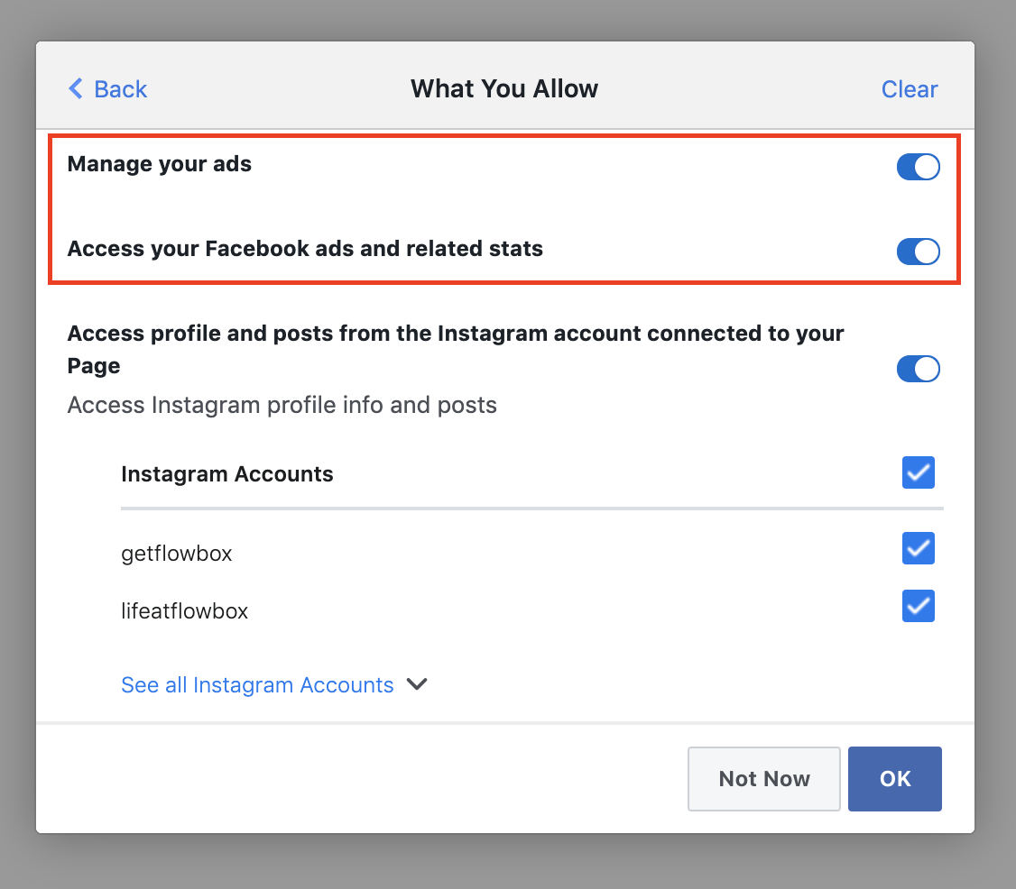 - Make sure that the permissions are turned on by clicking on 'What you allow' and checking that the 'Manage your ads' and 'Access your Facebook ads and related stats' toggles are switched on. Note: The permission will only allow Flowbox to send images to your Facebook Image Assets.
