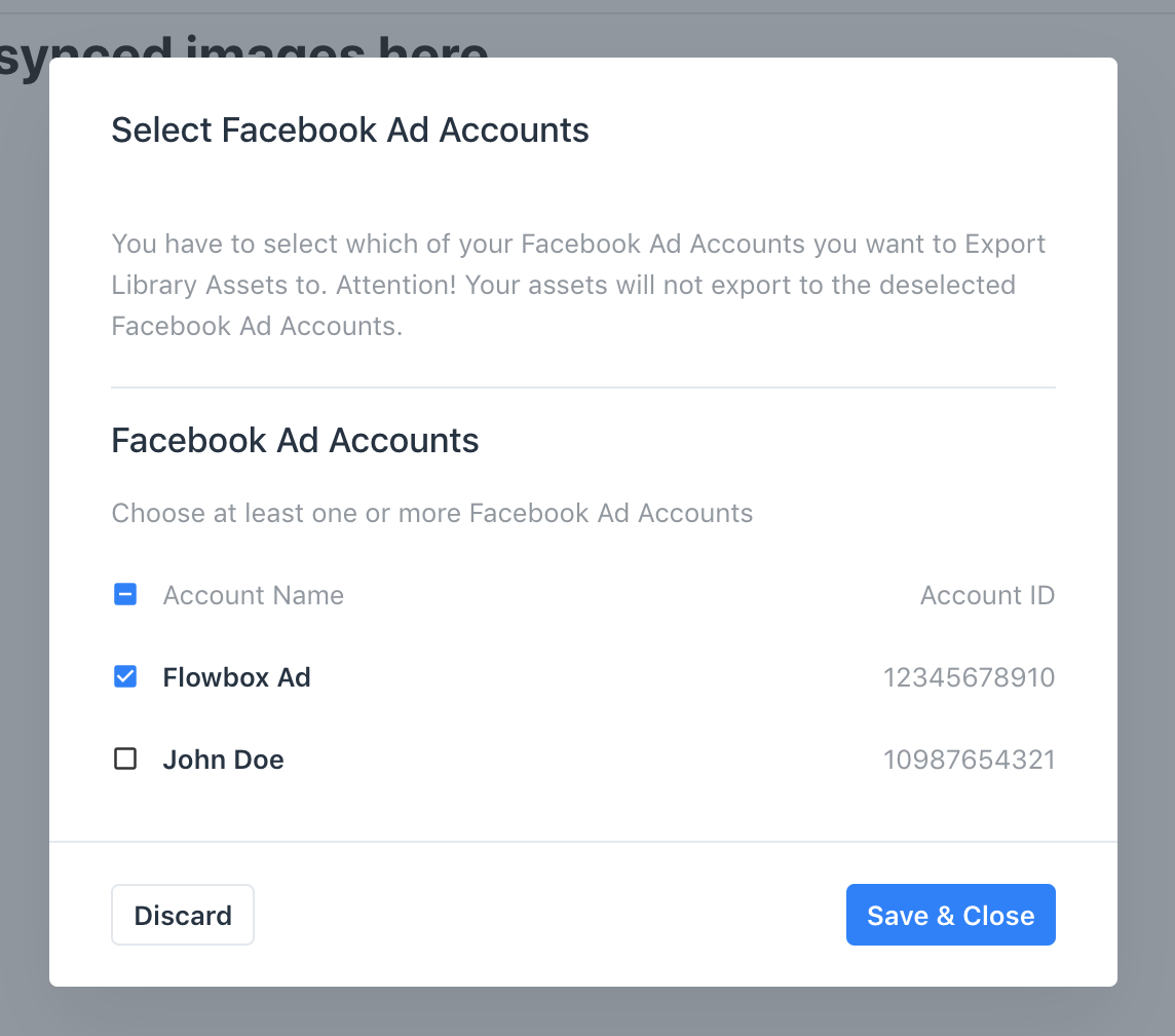 - A modal will now open and you can select which Ad accounts Flowbox can send assets to. You can go back here at any time and select/deselect Ad Accounts.