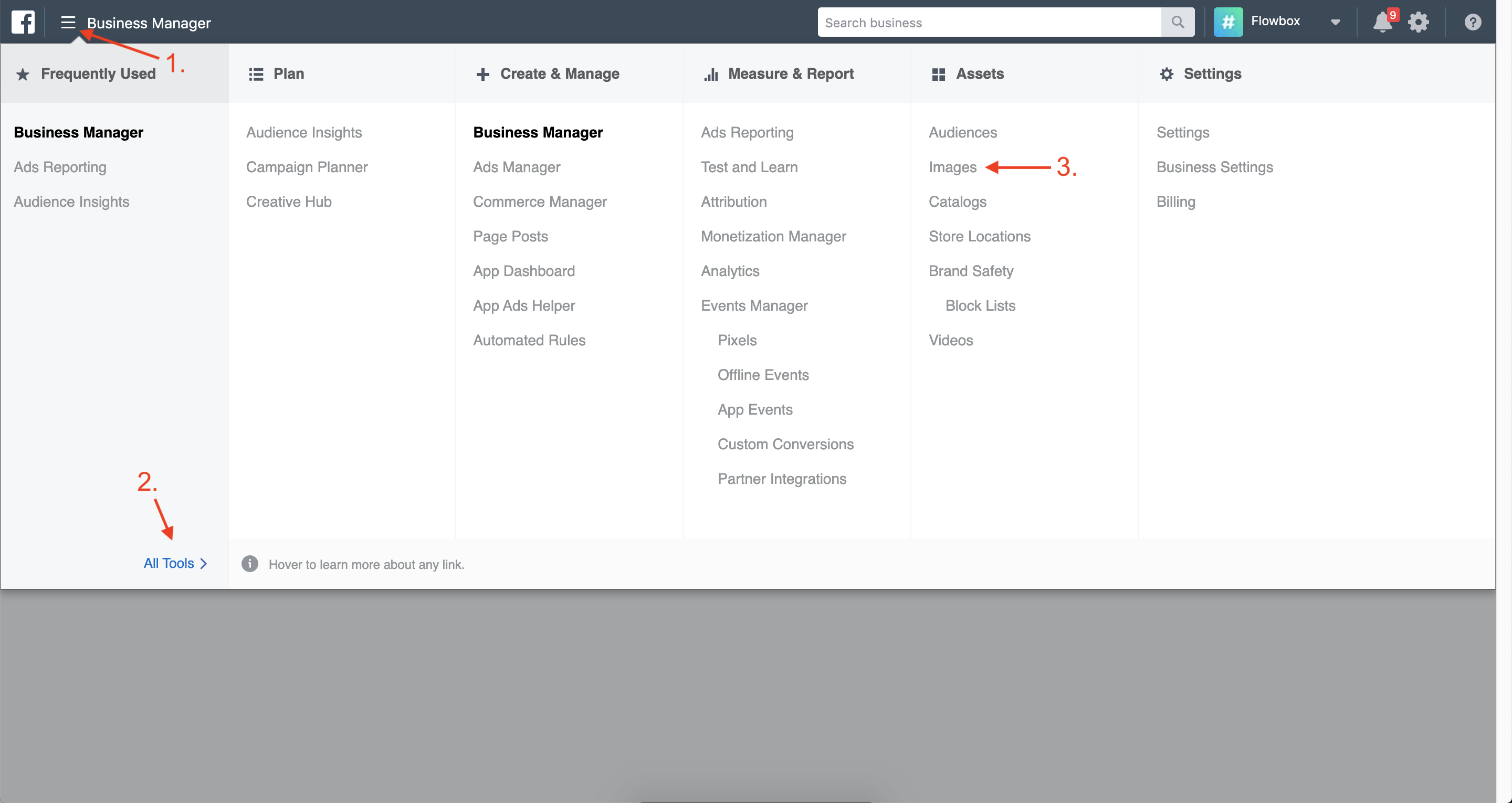 Under Assets, click on 'Images' (3) to access Facebook Image Assets.