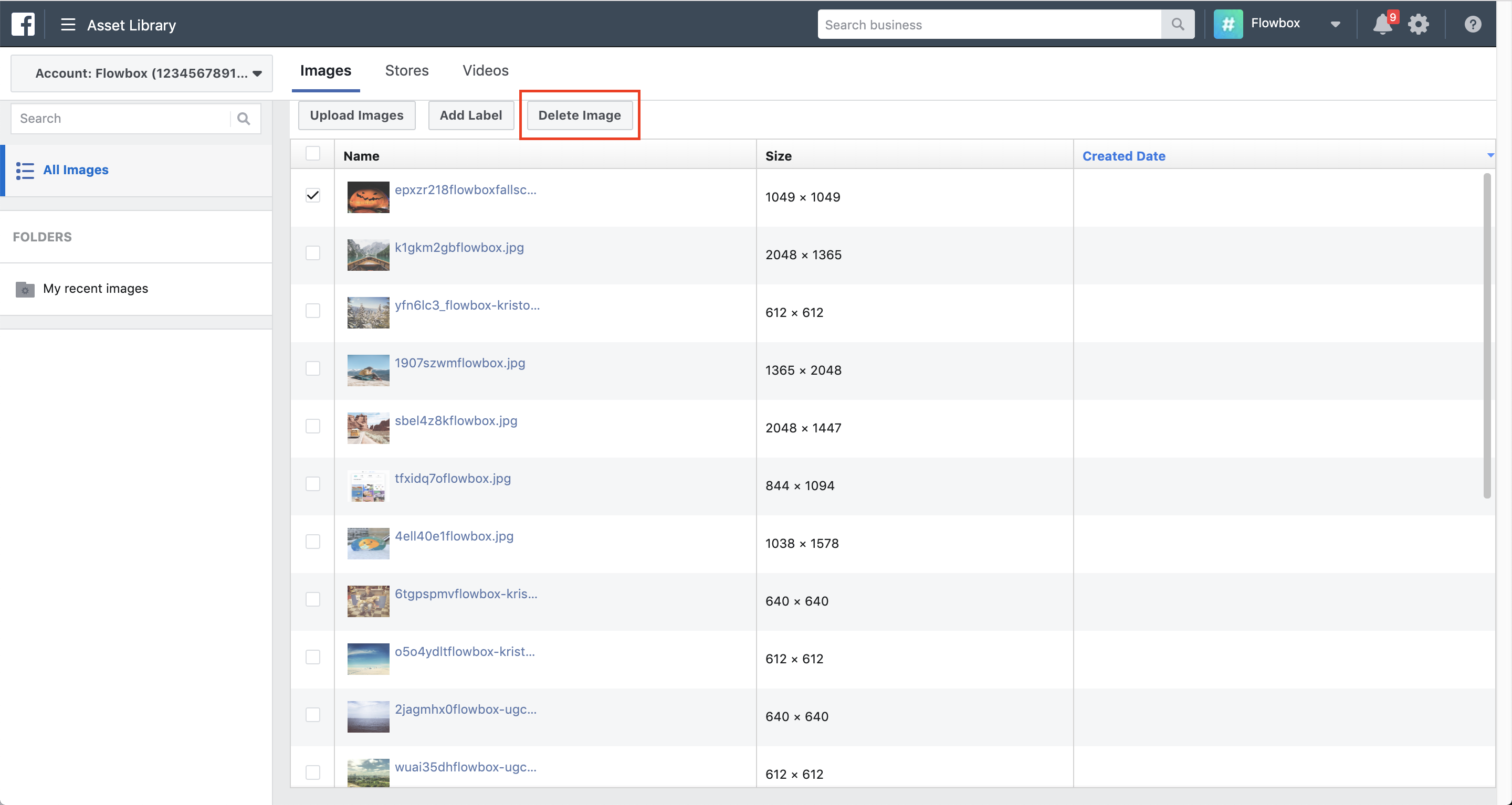 Any image(s) that you select will be permanently deleted from your Facebook Image Assets. If you want to add the image(s) back again, you will need to log into Flowbox and sync the image again.