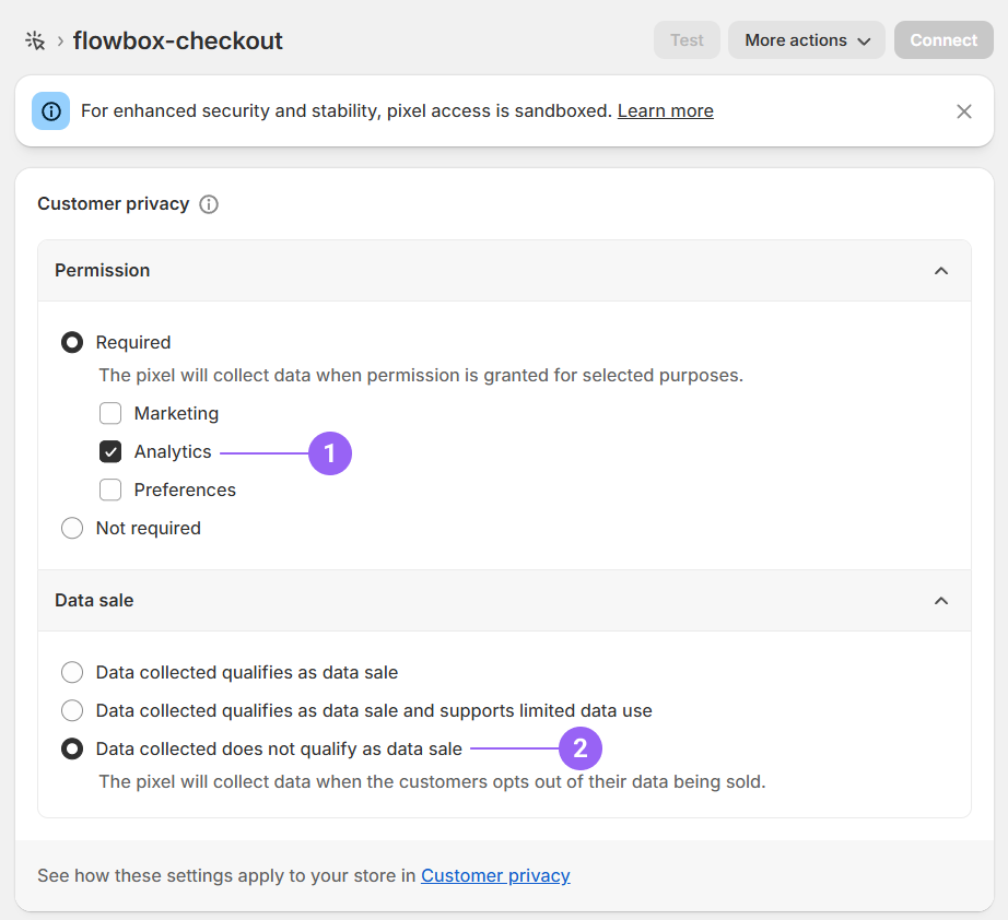 - In the Customer privacy menu, the only permission that needs to be marked in the "Permission" section is "Analytics". The rest should be unchecked.