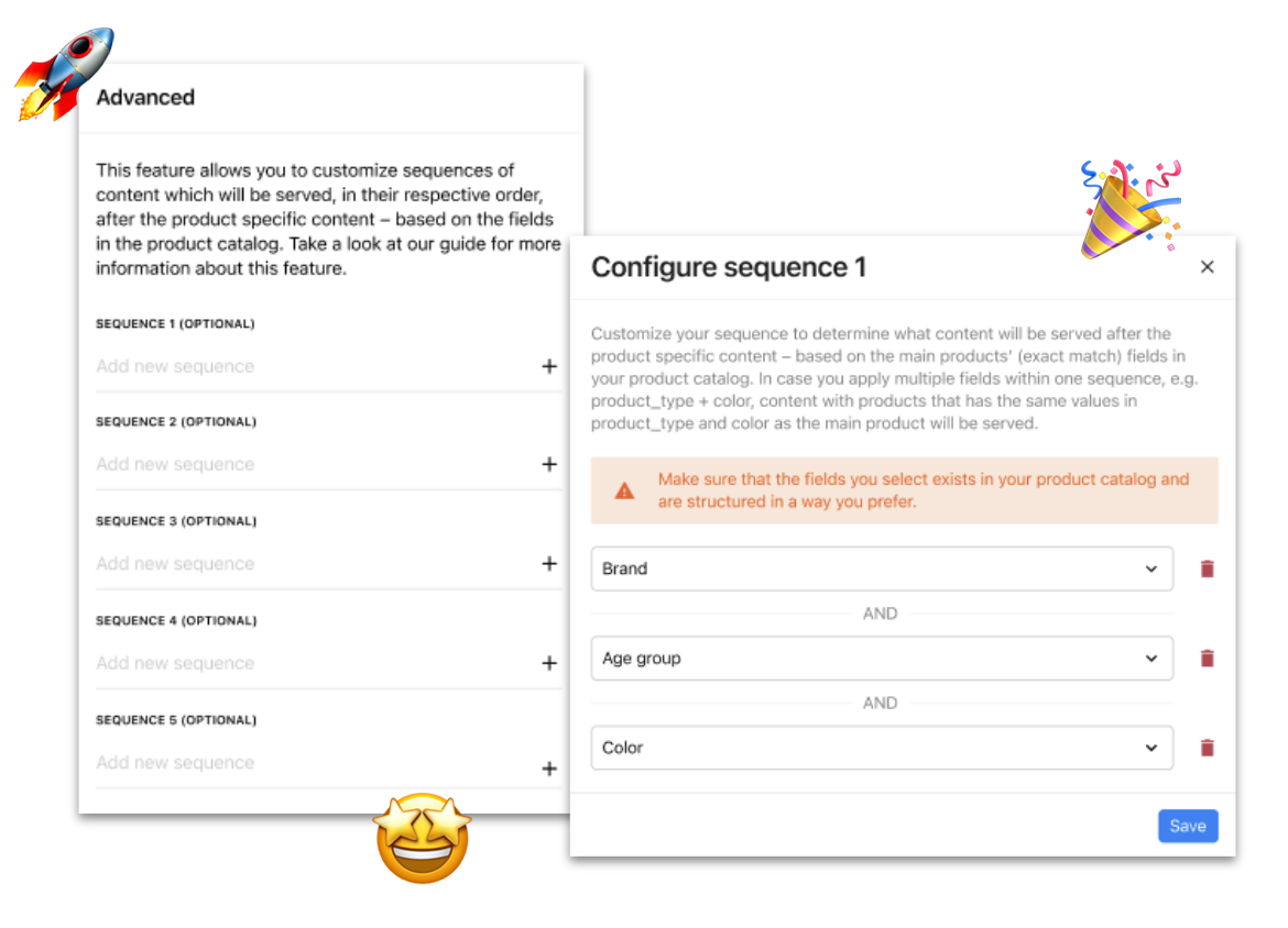 For example, perhaps you want content tagged with products that have the same color and brand as the main product (exact match) served as the first sequence and then content tagged with products with the same product type served as the second sequence. Everything is possible since itβs fully customizable, how you structure and build your product catalog is the only limitation.