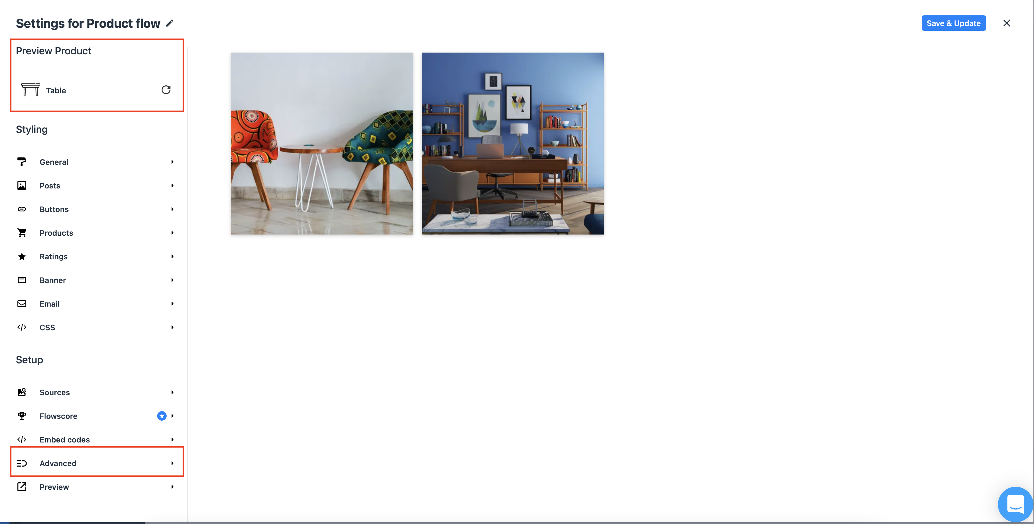 To set this up, youβll need to navigate to the settings of your Dynamic Product Flow. To access the Advanced menu, you first need to enter a product into the preview screen. Then click on 'Advanced'. in the menu below to begin configuration.