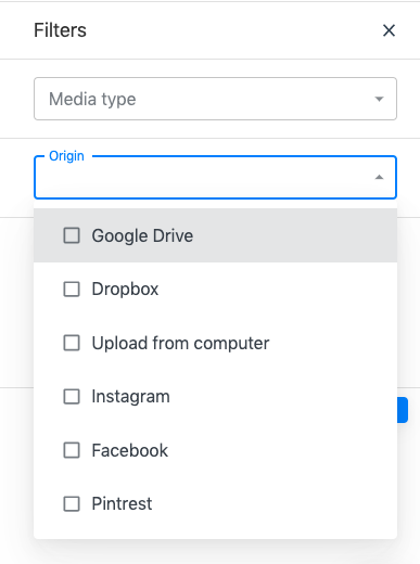 - Origin: show the content added from Instagram, Google Drive, Dropbox, Upload (from a computer), Facebook or Pinterest.