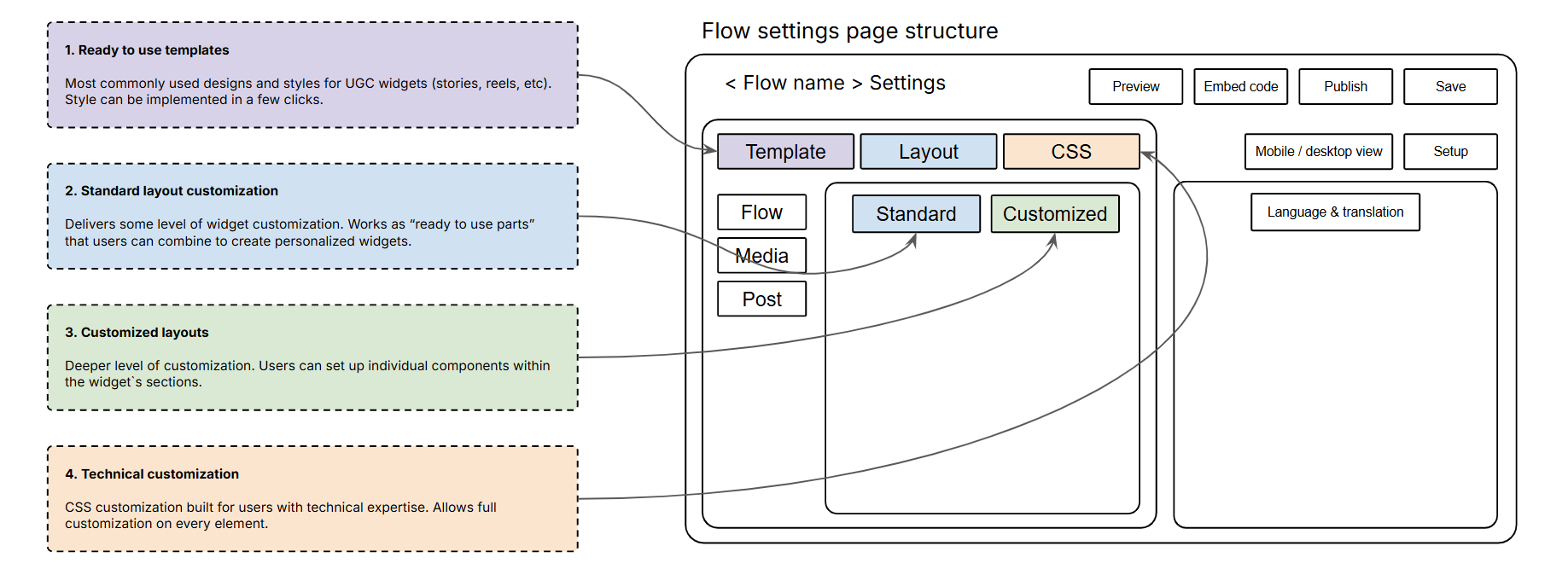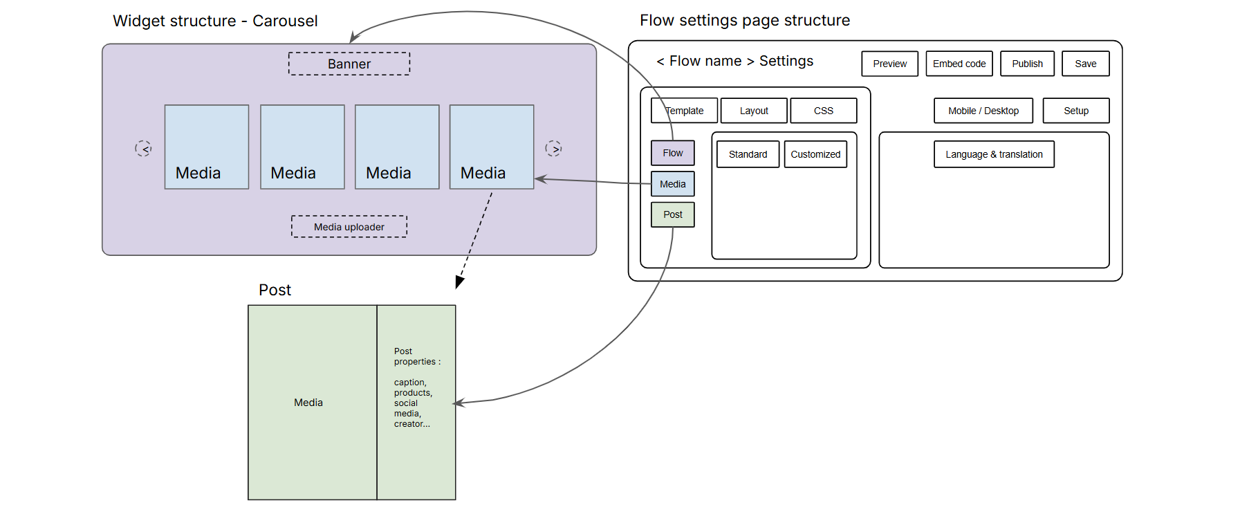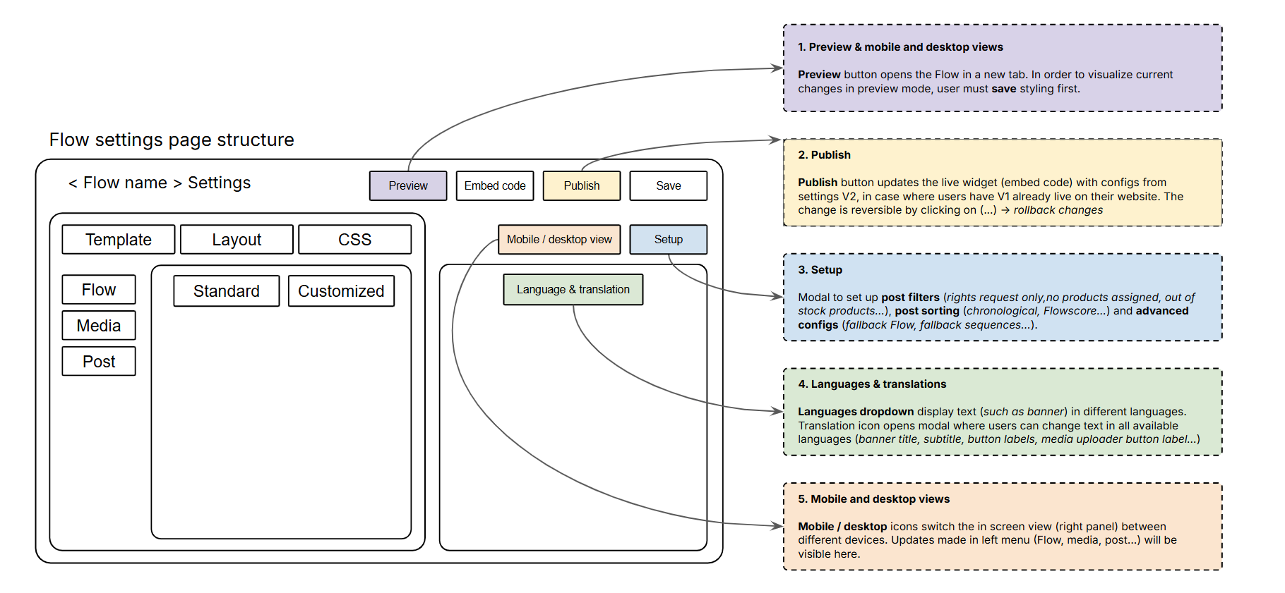 Flow design: cheat sheetMain structures & actions in Flow widget settingsProduct levelsFlow widget breakdownOther configs