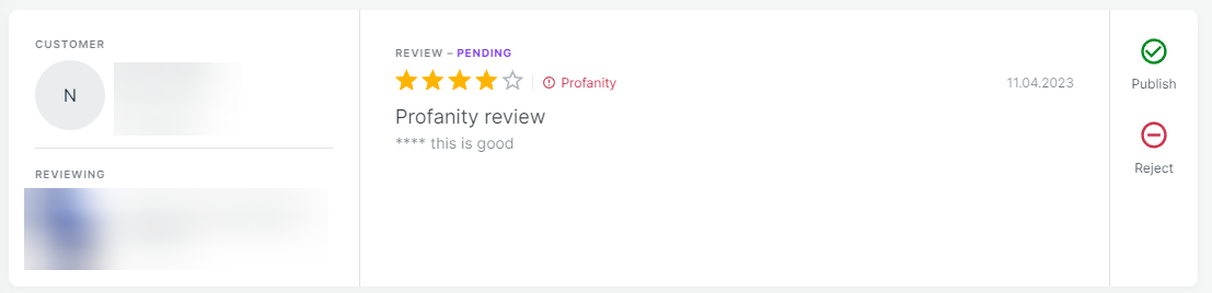 When the 'Block auto-publishing reviews with profanity' setting is enabled, it prevents the review containing profanity from being auto-published at all. It will be held for moderation and appear in the list of 'Pending' reviews where you have the option to either publish or reject it.