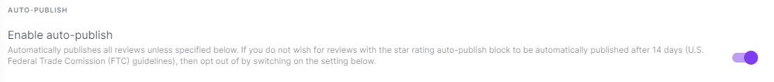 Reviews with the 'Block auto-publishing reviews with a rating below' auto-publish block will be automatically published after 14 days according to the U.S. Federal Trade Commission (FTC) guideline. If you do not wish to have this behavior, opt out by switching on the **'Opt out of auto-publishing blocked reviews'** setting below.