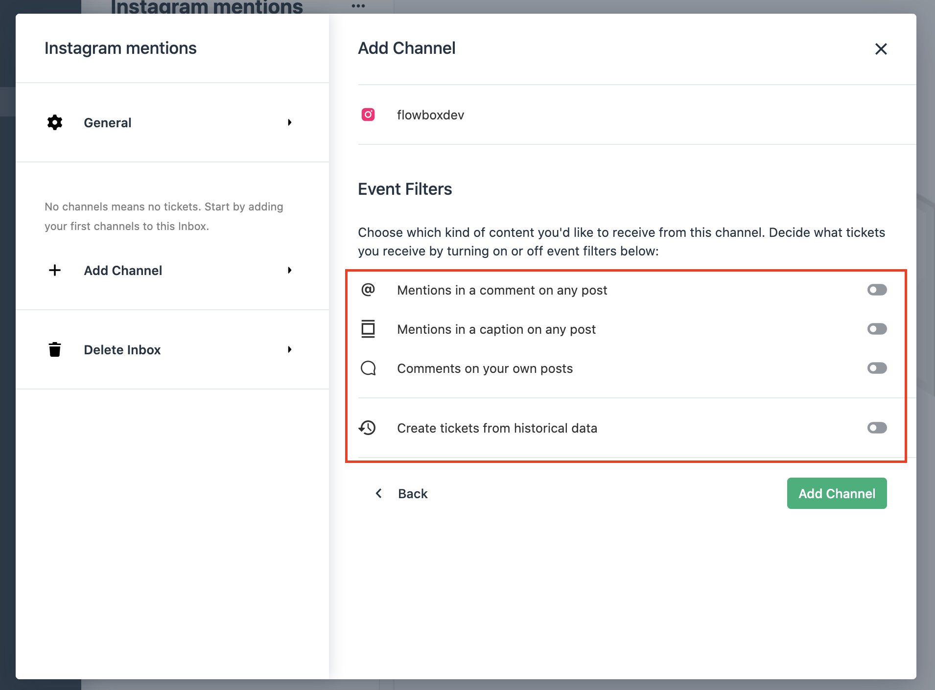 It's easy to set up an Inbox based on the social media accounts you have connected to your Flowbox account.