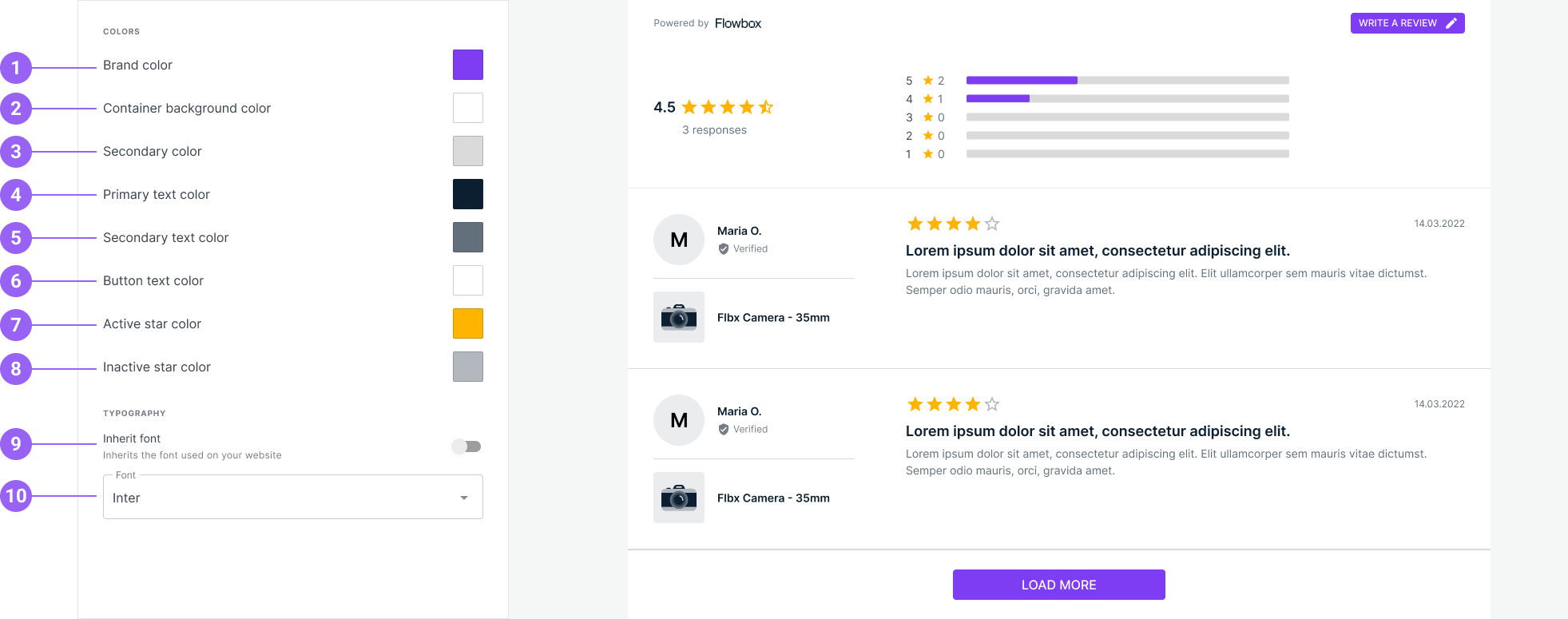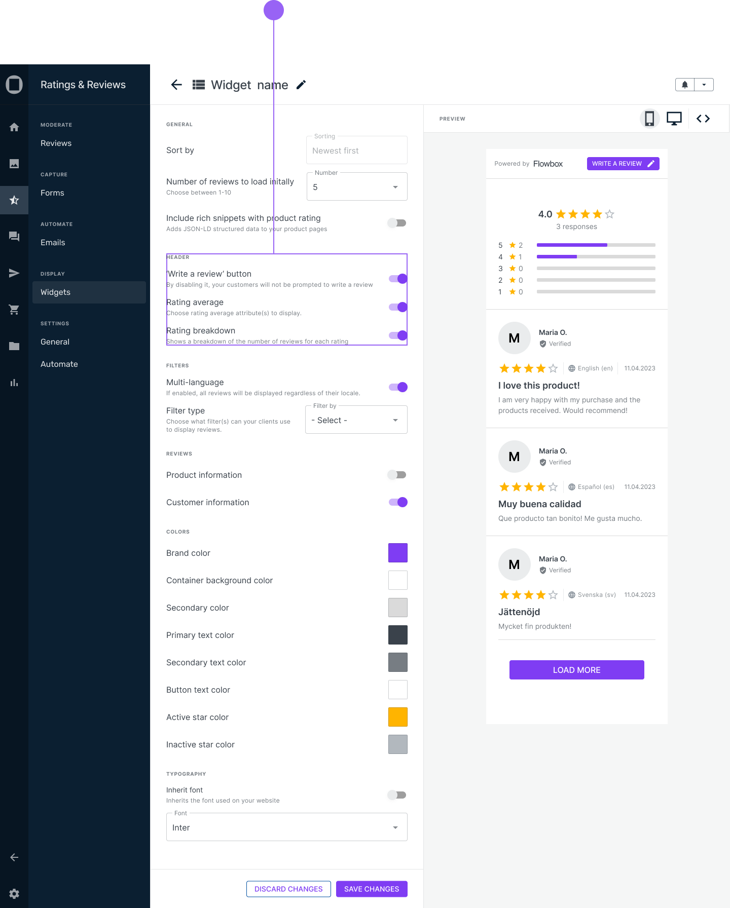 This will allow you to configure the appearance of the Review part of the widget. This review section is a concise summary that displays more detailed information about the customer, the product, and the actual review. You can decide to show/hide the Product information, customer information ora reply you have previously added to reviews.