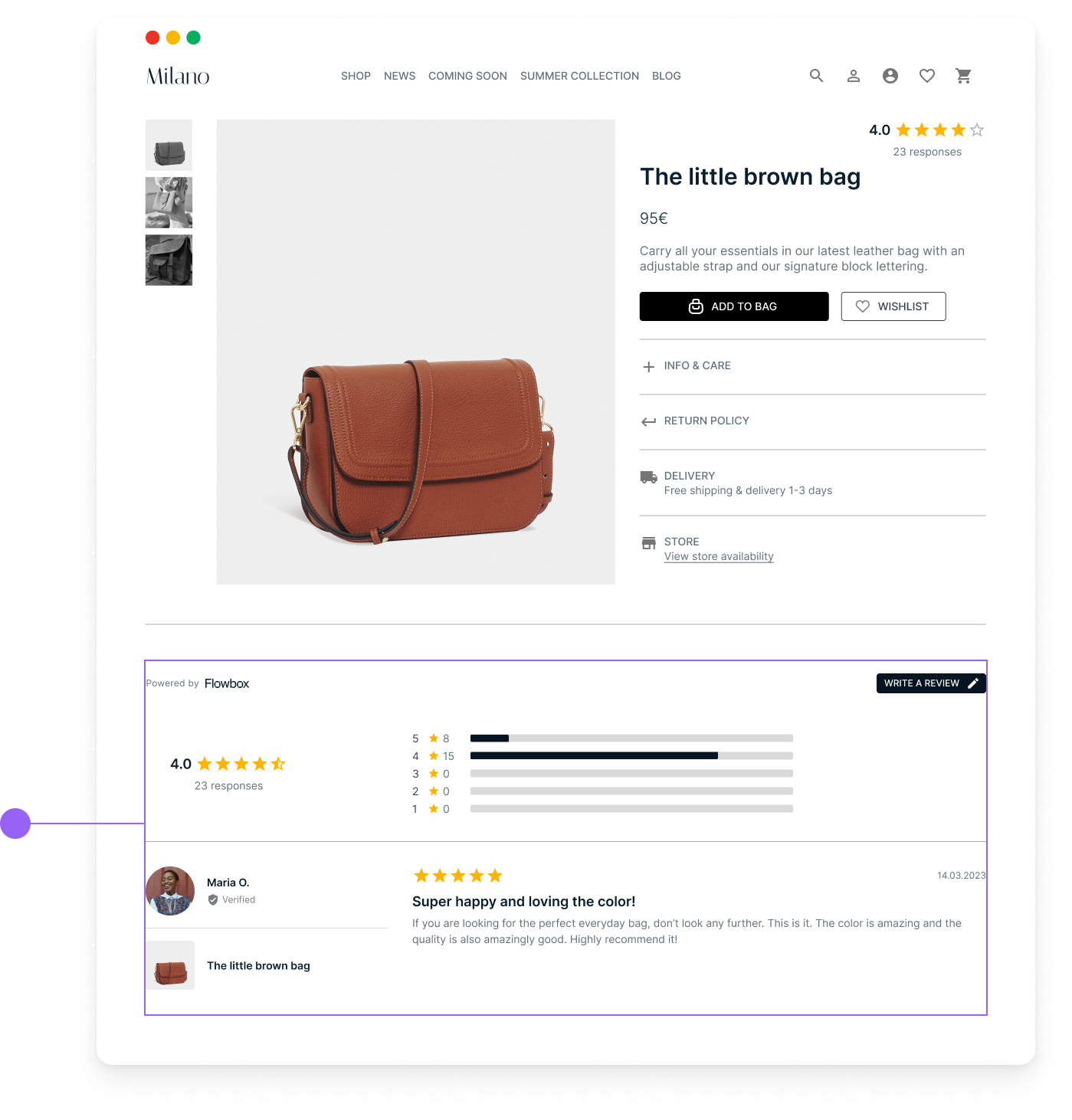 Displaying a review widget on your Product Detail Pages (PDP) is an excellent approach to showcase product reviews and highlight the superiority of your offerings. By leveraging this widget, you enhance the credibility of your products and instill trust in potential buyers, empowering them to make well-informed purchase choices based on the feedback and experiences of others. This powerful tool not only reinforces the quality of your items but also fosters a sense of reliability, ultimately driving customer confidence and boosting sales.