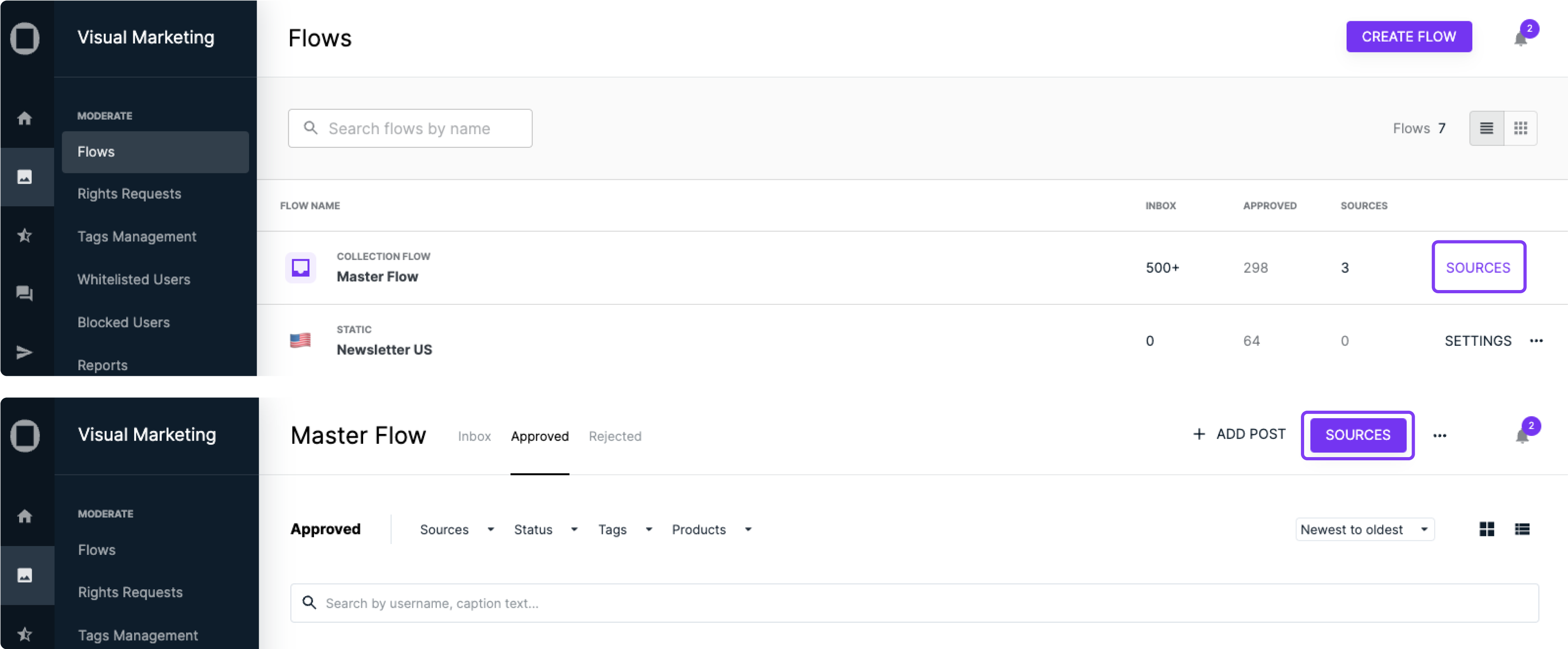 To access your Collection Flow sources, click on ‘Sources’ directly from the Flows page or use the top-right button within your "Master Flow".