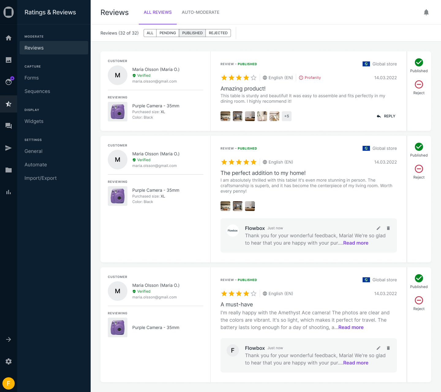 Flowbox lets your brand highlight great customer service directly on your product pages. Replies to reviews not only help shoppers make informed decisions but also show your brand’s commitment to customer care.