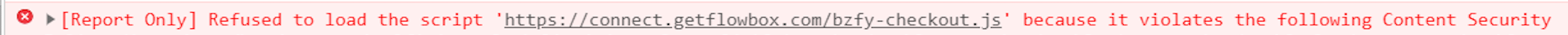 If you see an error message that states that the Flowbox script could not load due to Content Security Policy, you will need to add Flowbox to your CDN whitelist.