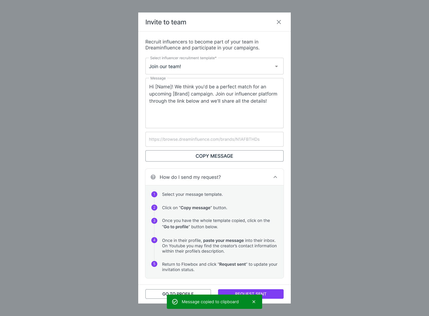 - A link to your recruitment page will automatically be added to the message, allowing creators to register and join your influencer team.
