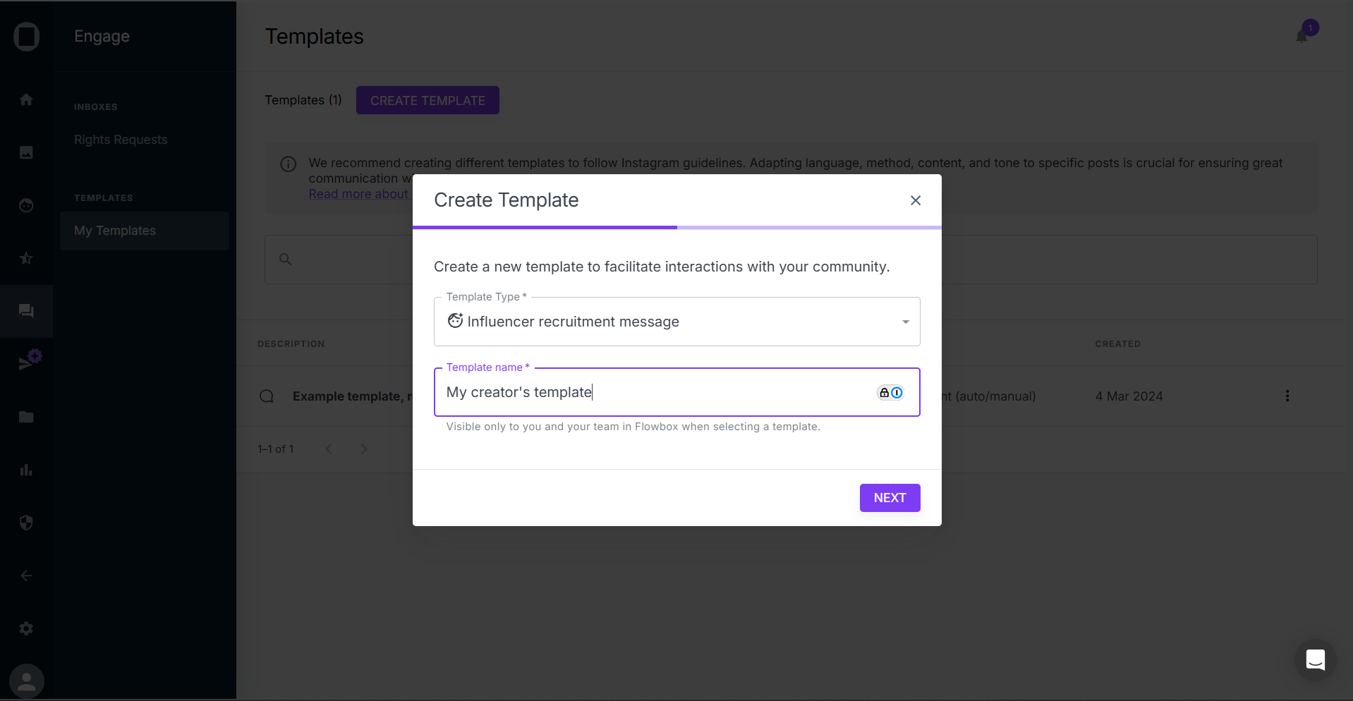 - Select the Influencer Recruitment Message type, give your template a name, and click Next.