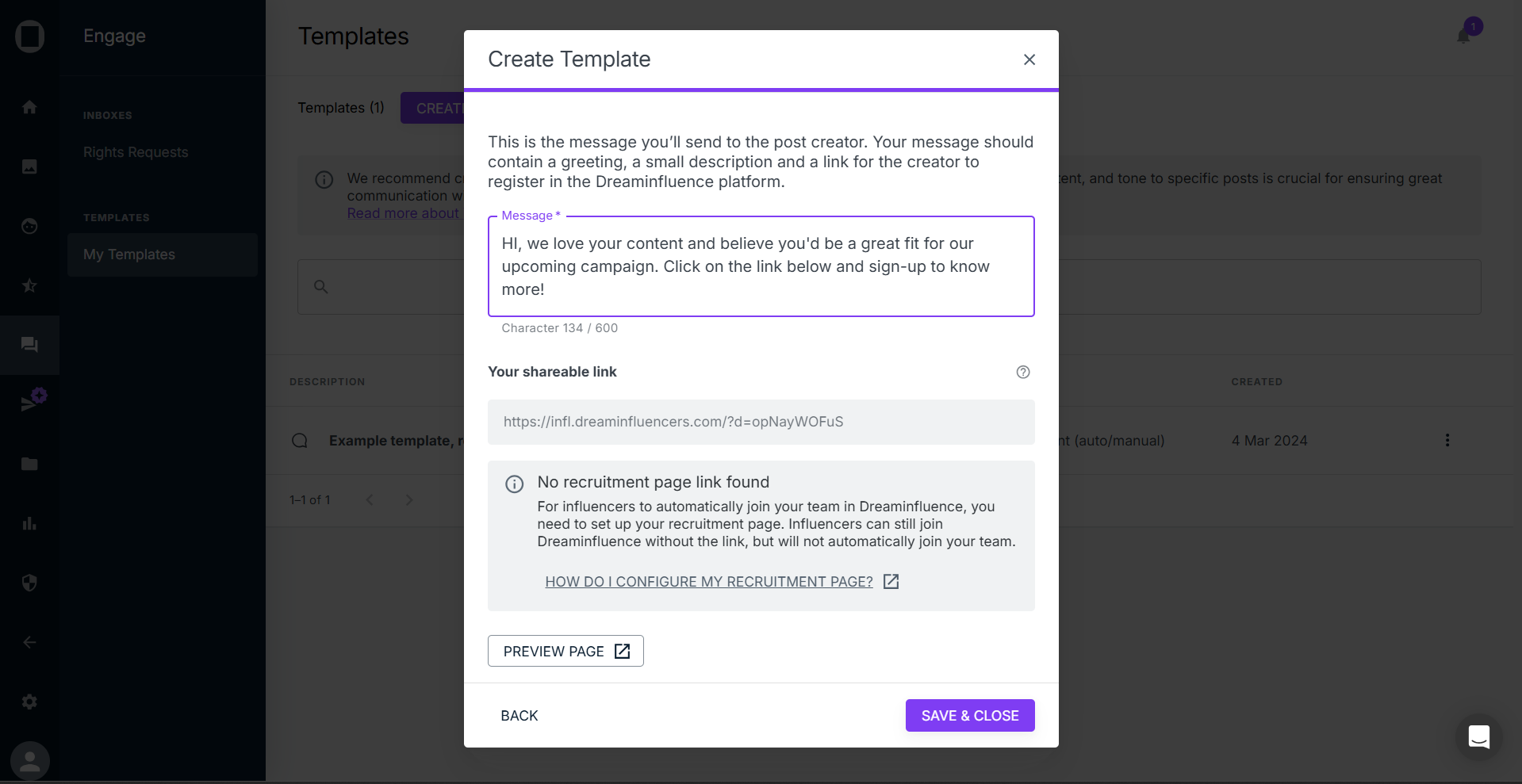 Important: If you do not yet have a custom recruitment page set up, the default Dreaminfluence registration page will automatically be added to the message.