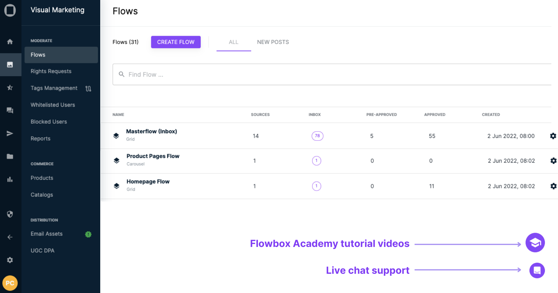 - In this section you can create and edit the Flow(s). Within each Flow you will collect the content, moderate it, adding tags and products, and finally distribute it to any other Flow.