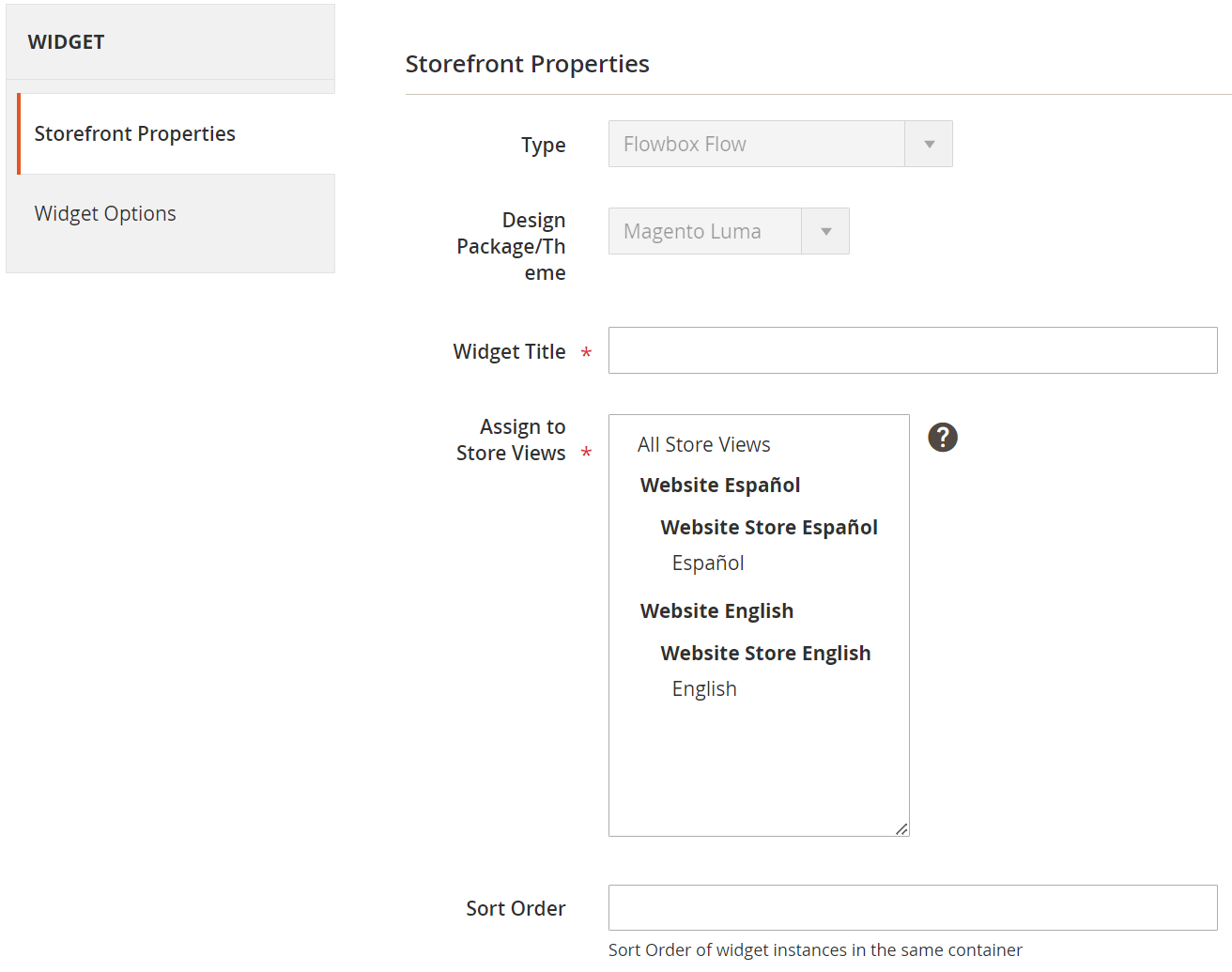 The following page is comprised of 2 sections, Storefront Properties and Widget Options.