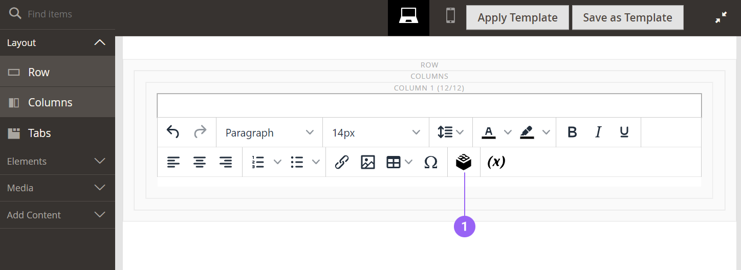 Under the Content collapsible tab, click on the "Edit with Page Builder" button. Select or create a new Text box, and then click on the "Widget" icon: