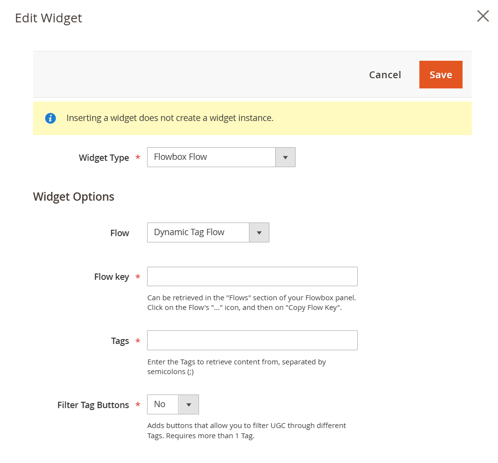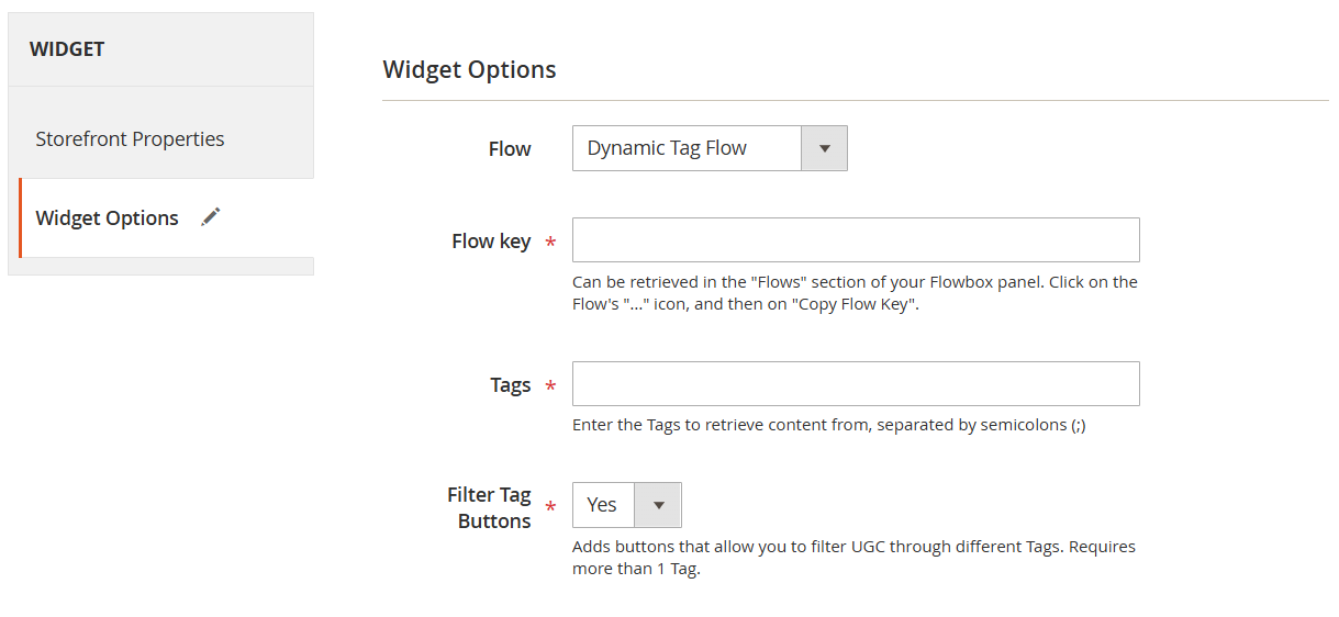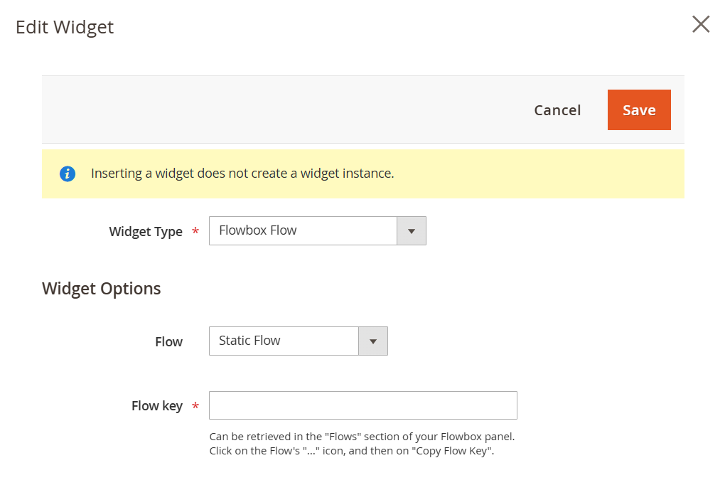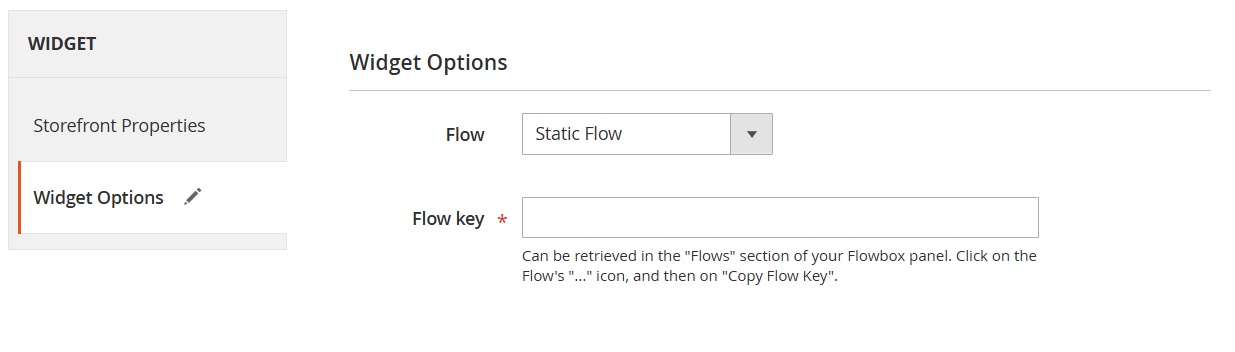 The Magento Extension injects Flows in web sections using Magento's Widget System. It's possible to integrate Flows through 2 methods: by creating a Flowbox Widget in the Widgets section and assigning it to a specific container, or by directly inserting it a specific CSM page through the Page Builder.