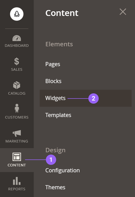 Widgets in Magento allow us to introduce our content in predetermined sections according to our installed Theme. The Widgets can be found in: Content > Elements > Widgets