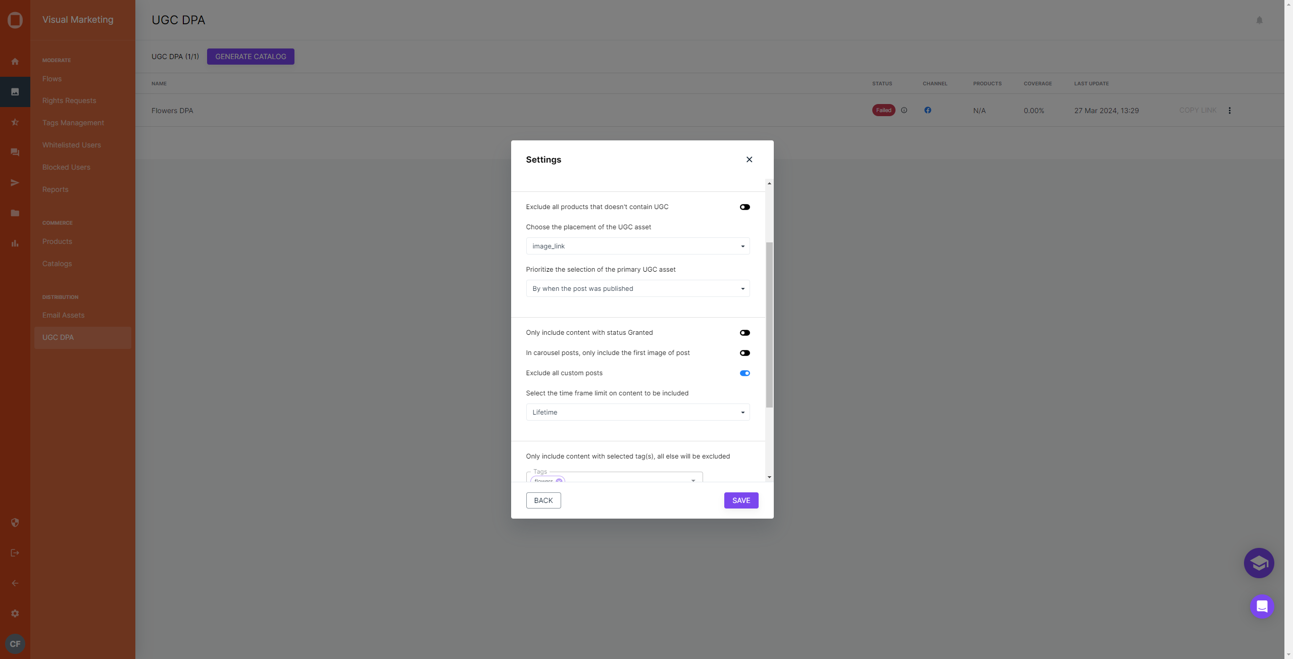 After moderation in the media management tab, carousel posts adhere to the same conditions applied to User-Generated Content (UGC) Dynamic Product Ads (DPA) and email assets. If a carousel post meets the criteria for DPA or email asset inclusion (e.g., it features products tagged from catalogs), it will be included in the corresponding ad campaign.