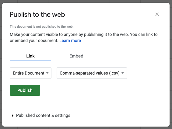 Once you have created your feed, you'll need to export it. Create the feed in Google Sheets, where you can use the 'Publish to web' function to generate a link that you'll use to generate the Catalog in Flowbox. Make sure to select "comma-separated values (.csv)" from the dropdown list: