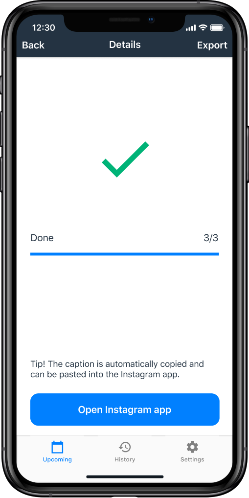 - In the post view, tap on the 'Export' in the upper-right corner. The post's media will be downloaded to your device. See how to do that in action: