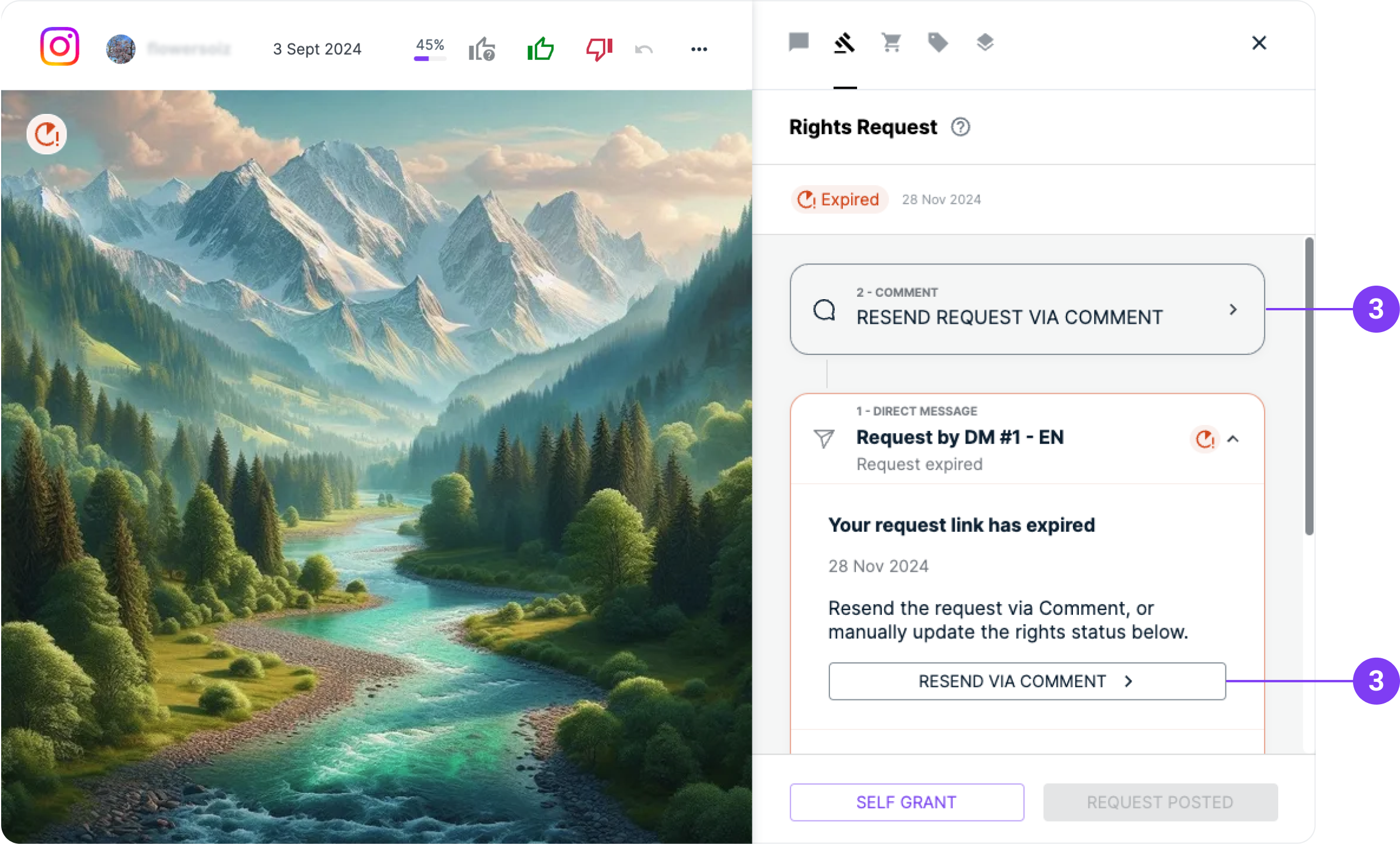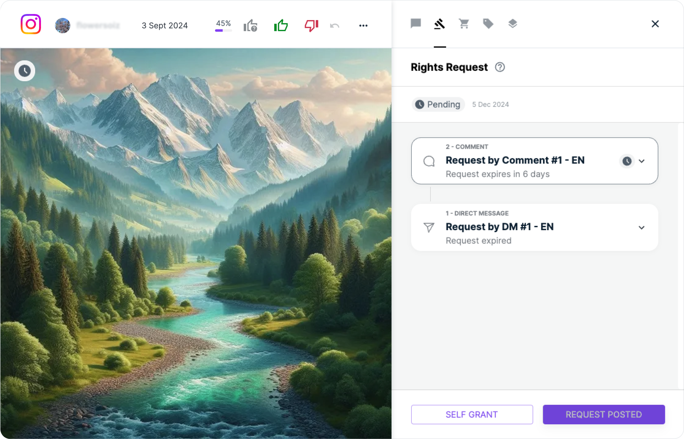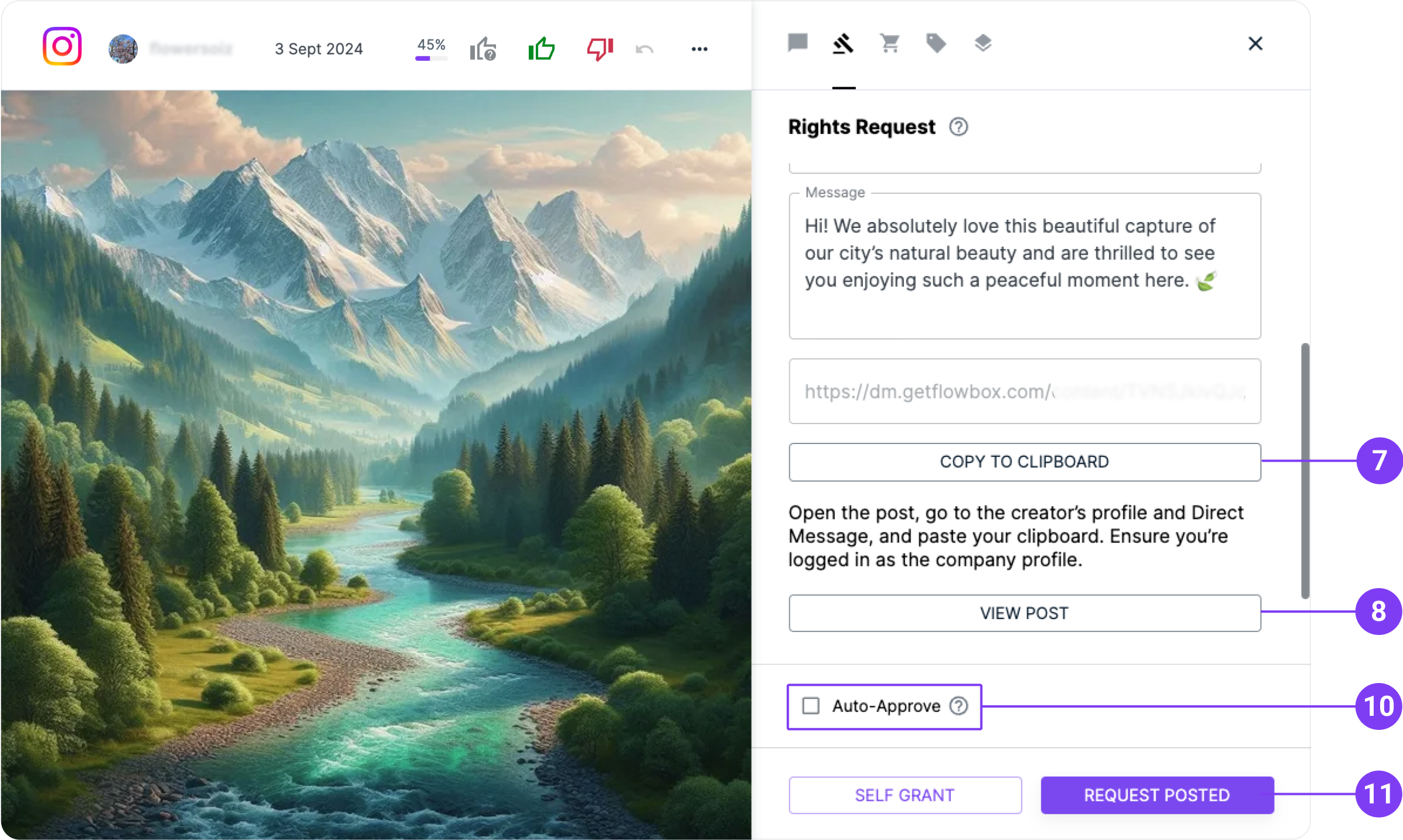 If you have obtained the rights to a post through an external channel other than Flowbox, you can manually mark it as Self-Granted.