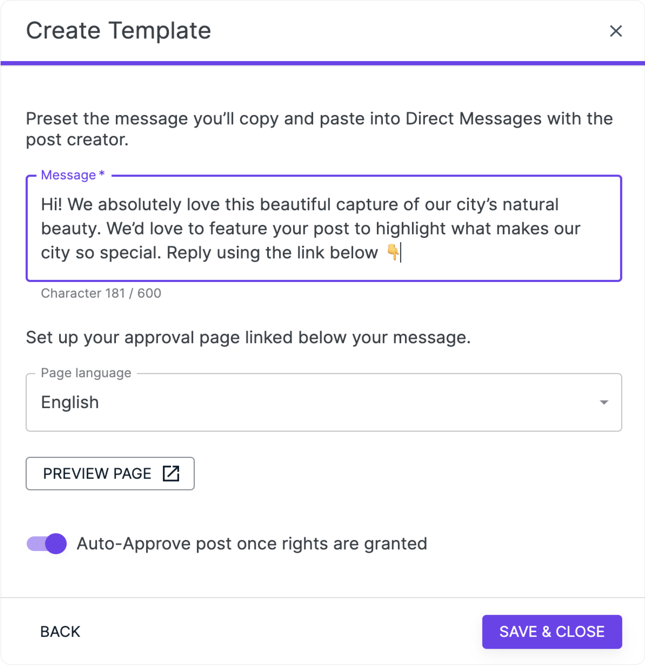 - Approval page language: in addition to your message, a link will be included in your direct message. This link allows each creator to approve or reject the request. To preview the approval page in different languages: