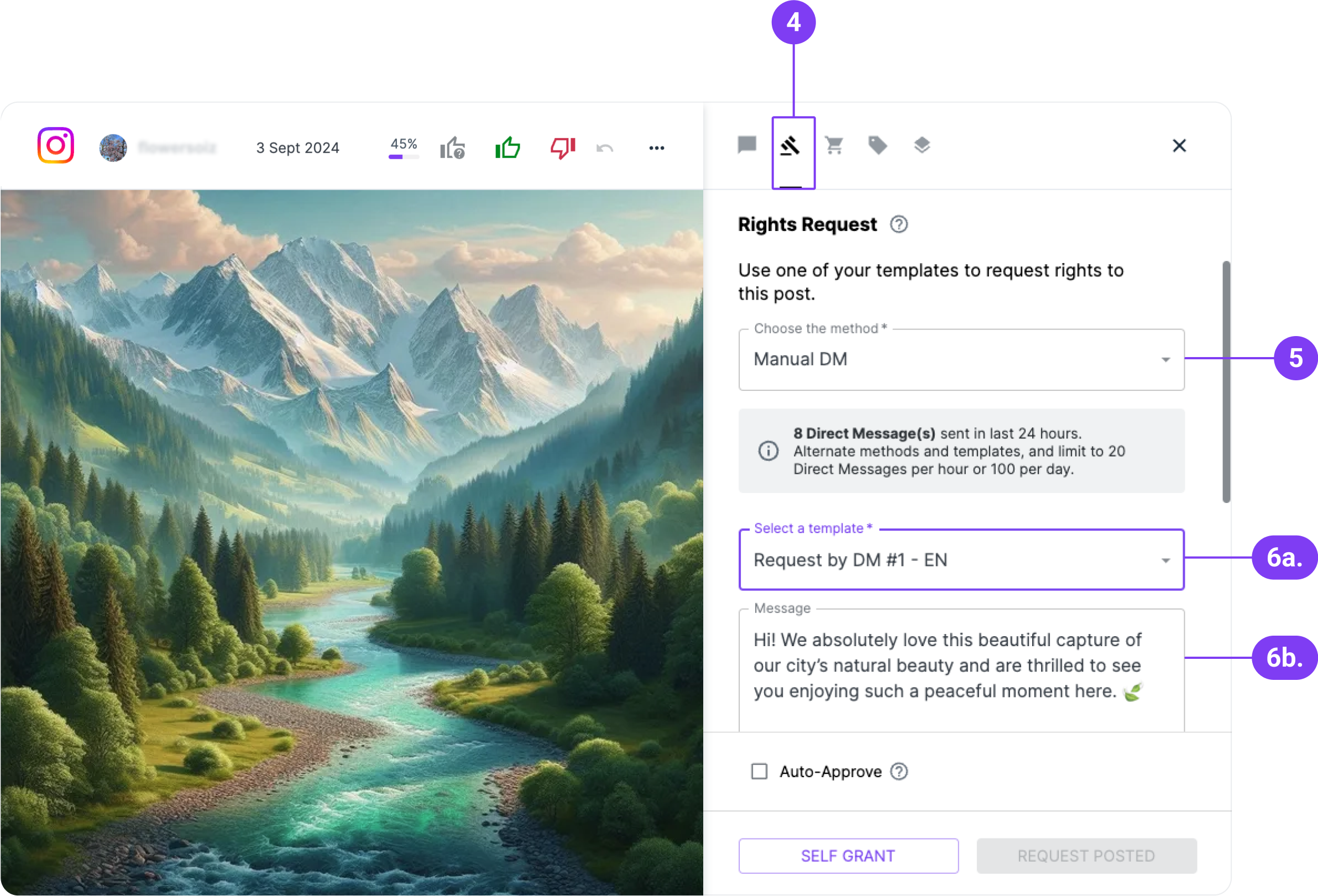 - Optional: To automatically approve the post once the Rights Request has been granted, you can toggle ‘on’ the switch 'Auto-Approve'.