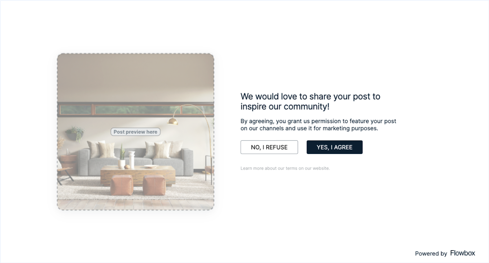 We highly recommend asking for permission before using your users' content by sending Rights Requests. Don't worry, Flowbox makes this easy by letting you send the request through a comment or DM. Please note that the Rights Requests feature is only available for posts collected from Instagram and Tiktok.