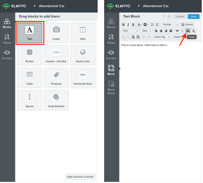 - To add a text image block, simply click the ‘Blocks’ menu and select and drag ‘Text’ to your email template.