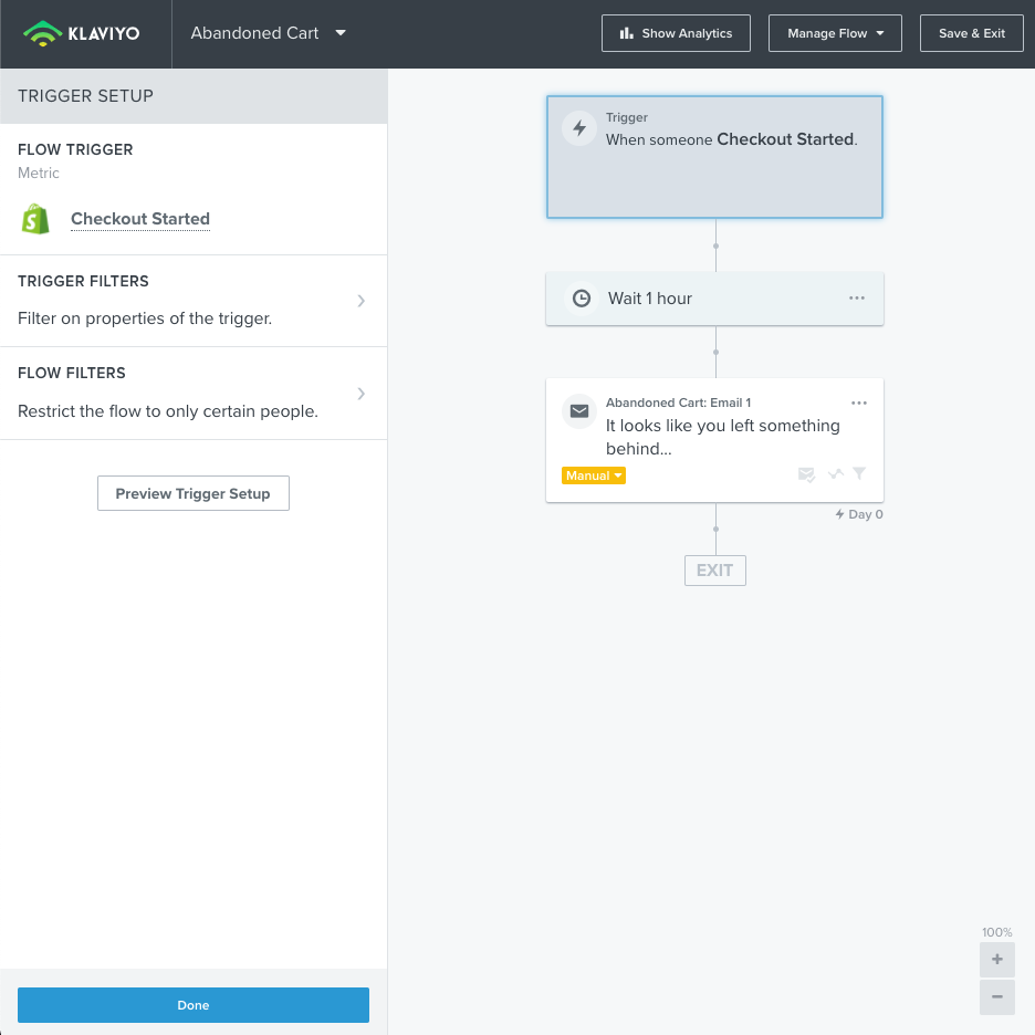 When you log in to Klaviyo, you first need to go into an existing template or to create a new automation flow, in this case, an abandoned cart sequence. You’ll want to select your trigger, a waiting period, and then your email draft.