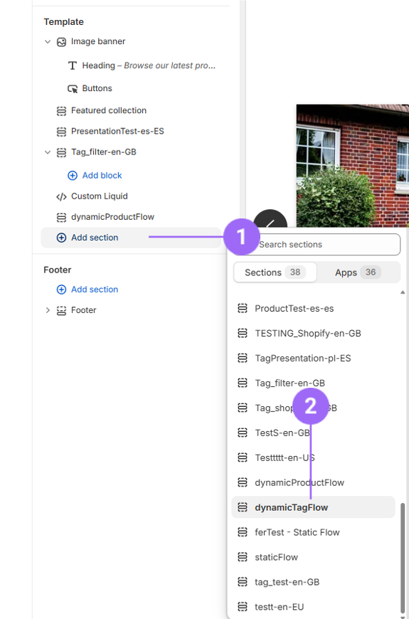 - To add the Flow to your page, click "Add section" and search your Flow by typing the name that was previously set up. Then, select it from the dropdown menu: