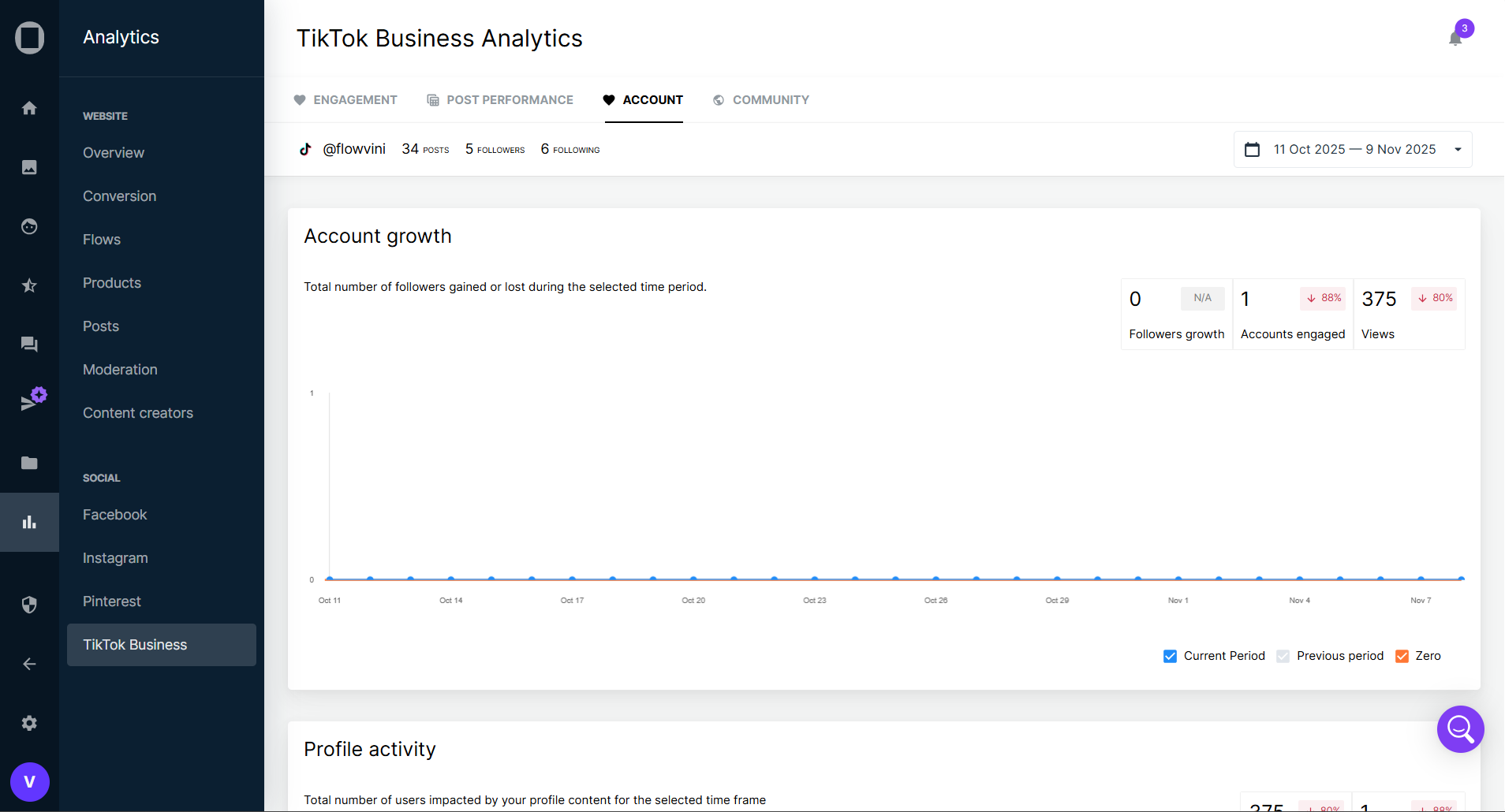 - Account growth – Follower evolution over time, based on the selected period