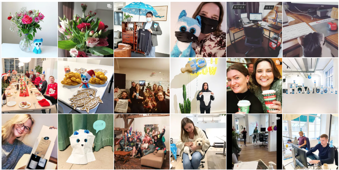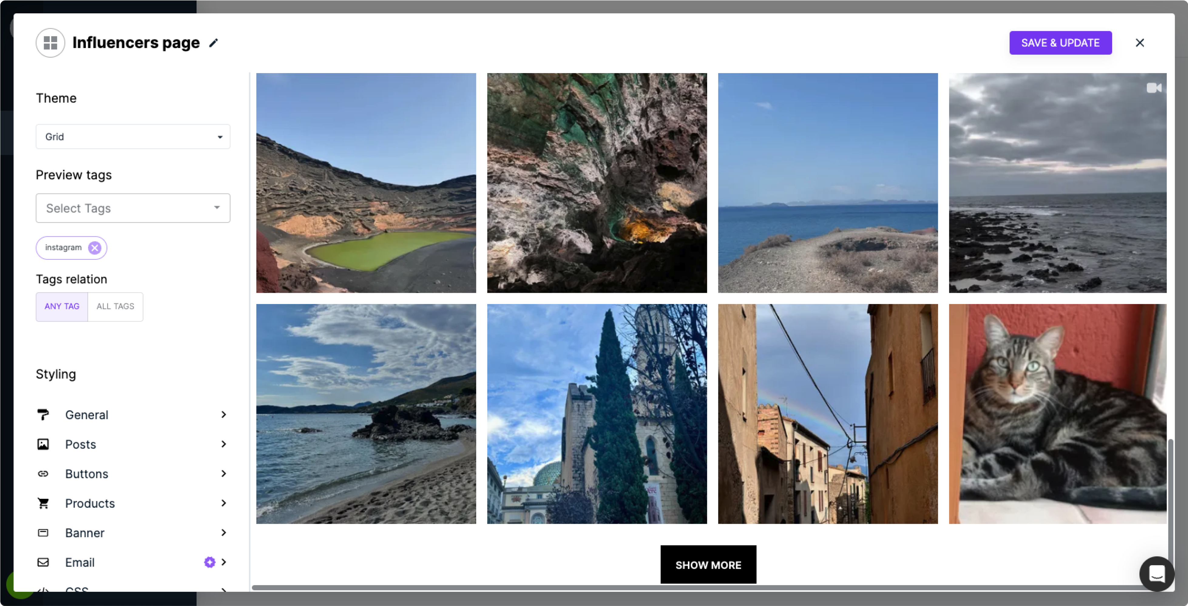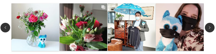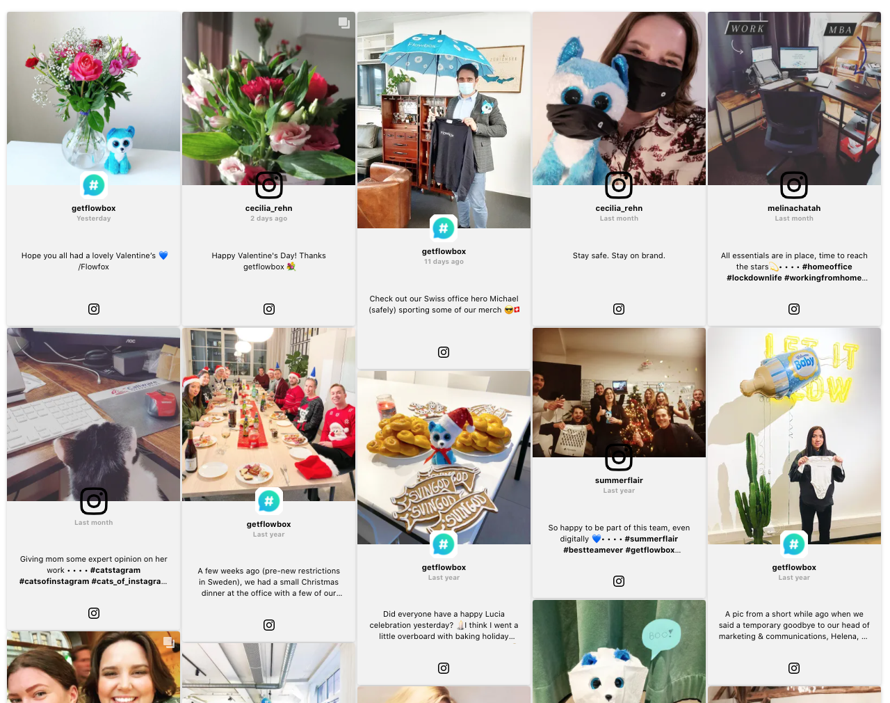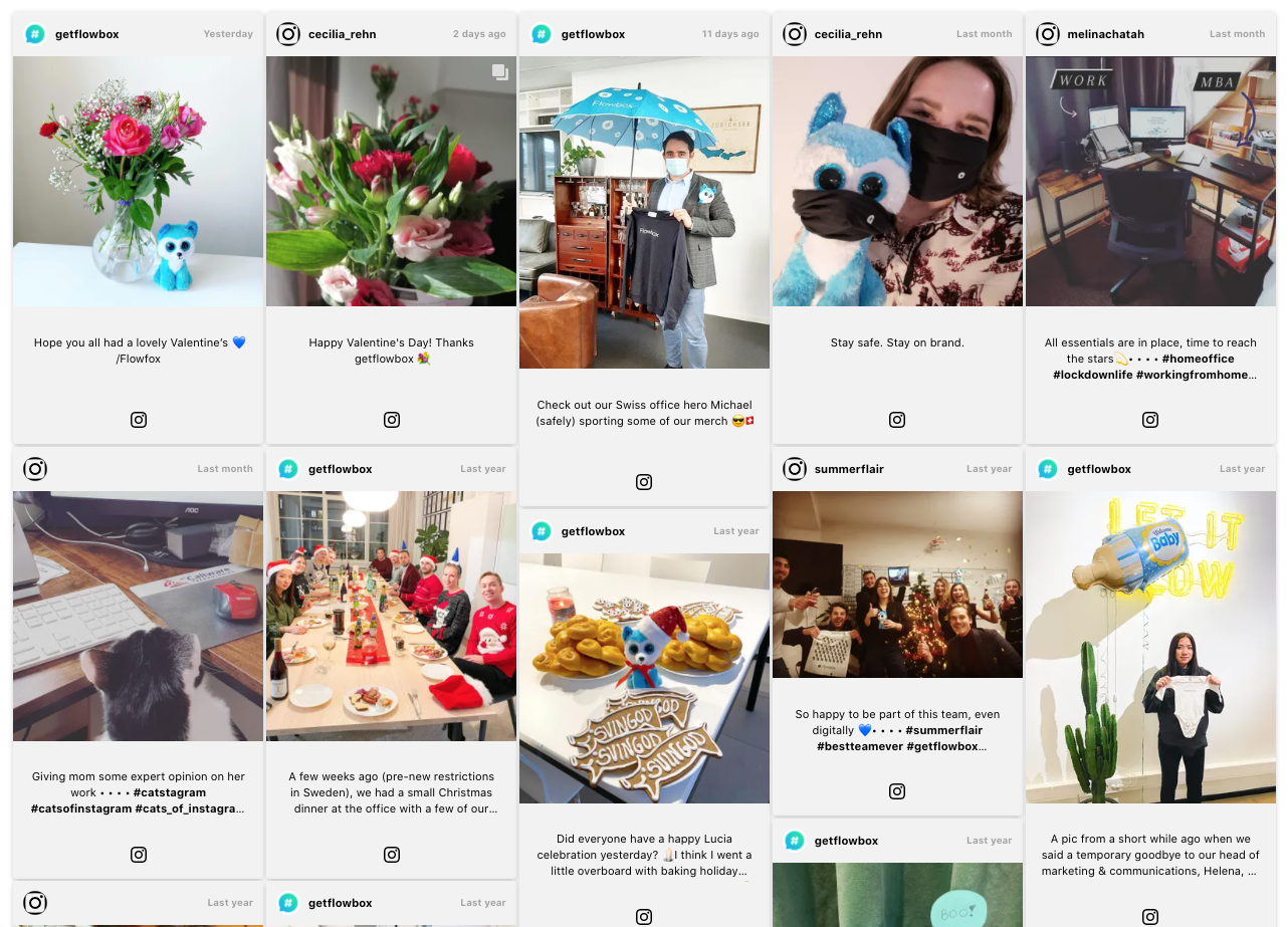 Displays up to 29 posts in a one-row carousel. This Flow theme works well on a Product page, to incorporate user-generated content alongside product images.