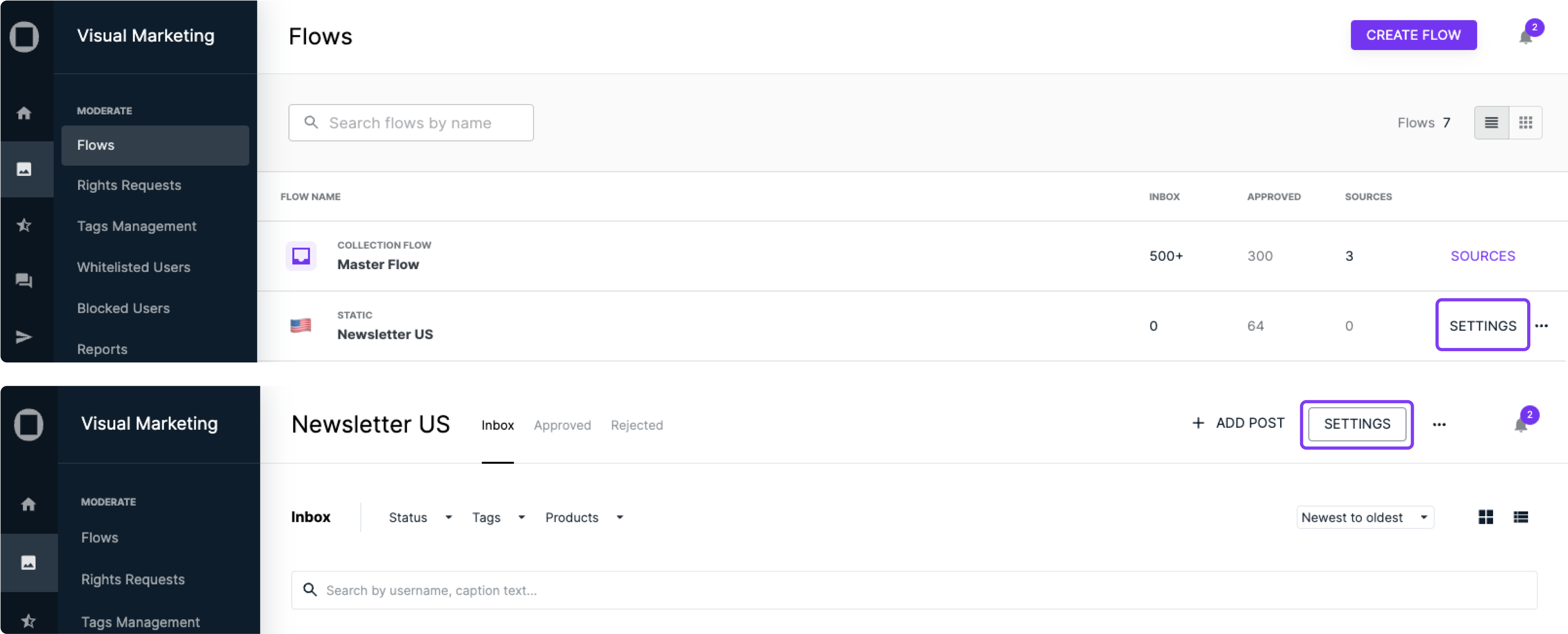 To access the settings for your Flows, click on ‘Settings’ directly from the Flows page or use the top-right button within each Flow.