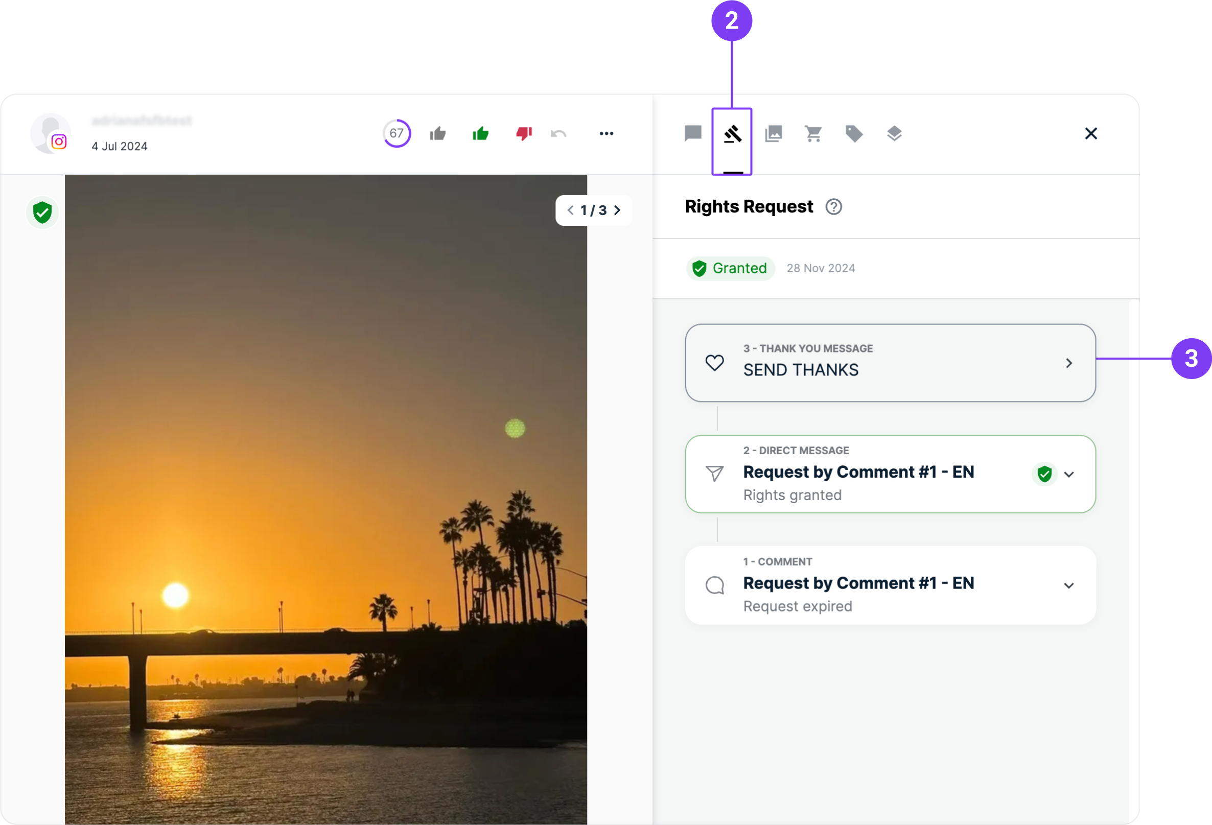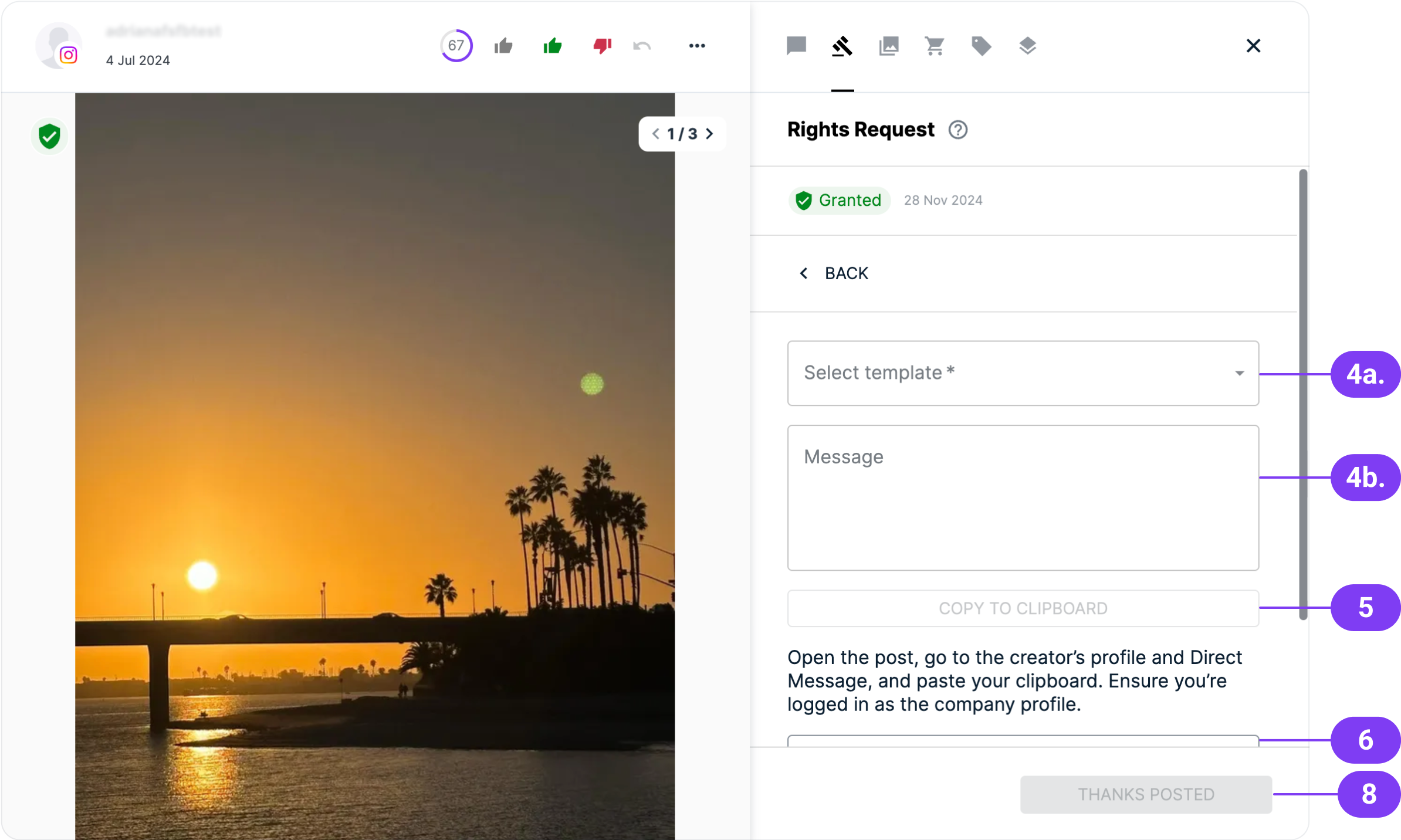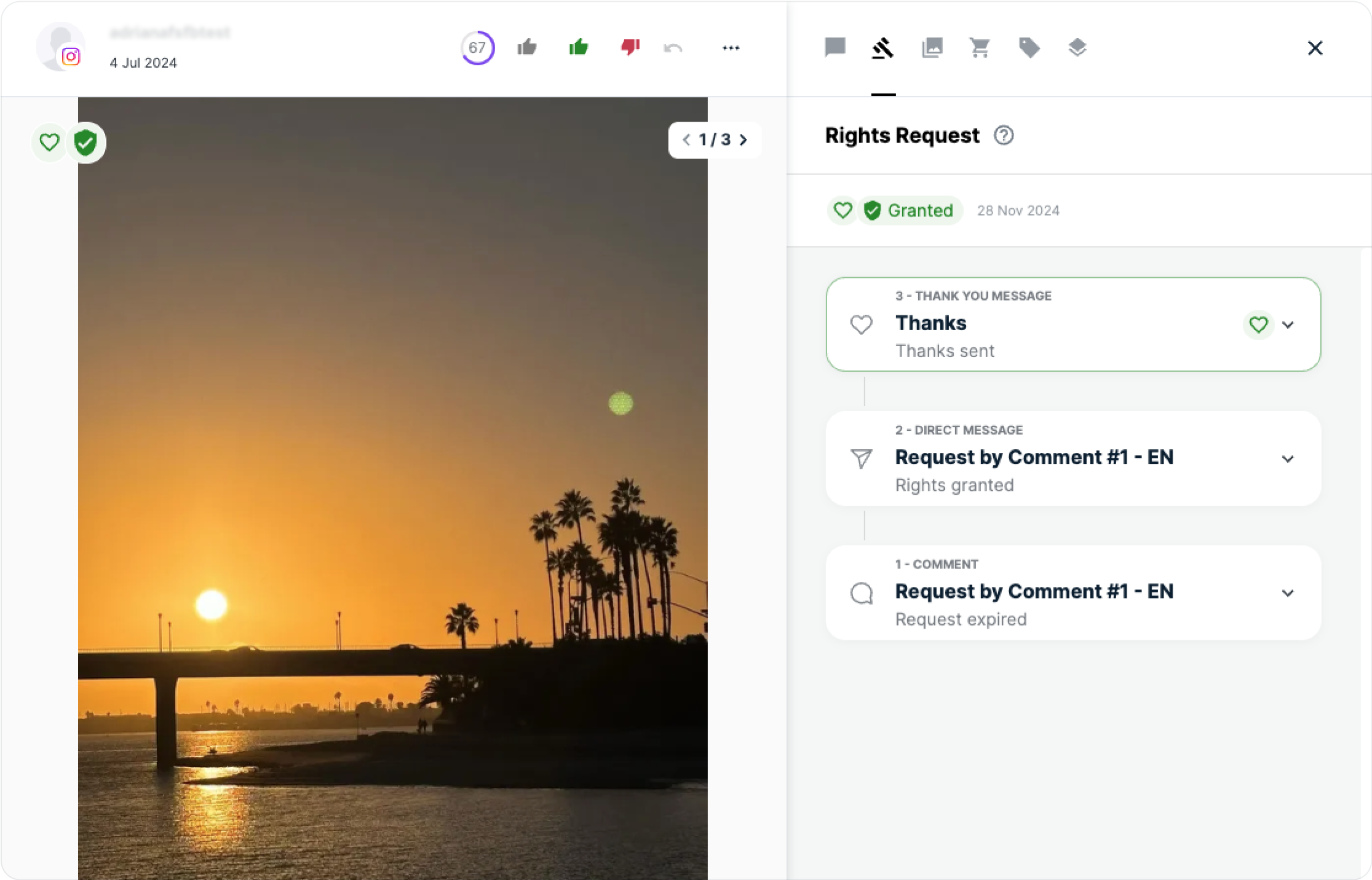 We highly recommend thanking your customers after they granted you the rights. Don't worry, Flowbox makes this easy by letting you send a Thank You message through a Comment or DM. Please note that the Rights Requests feature is only available for posts collected from Instagram and TikTok.