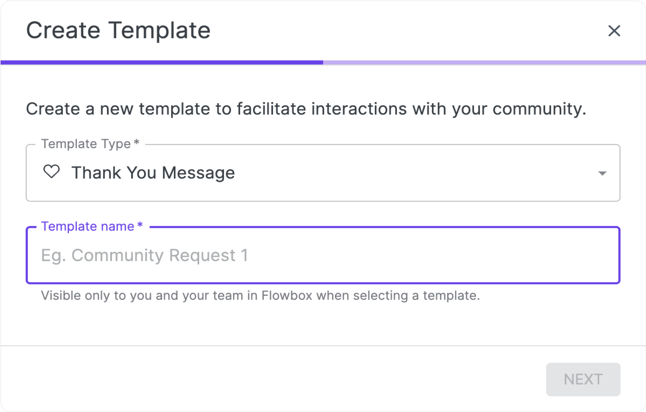 - Select your template type, for example, 'Thank you Message' and give your template a name, then click on 'Next'.