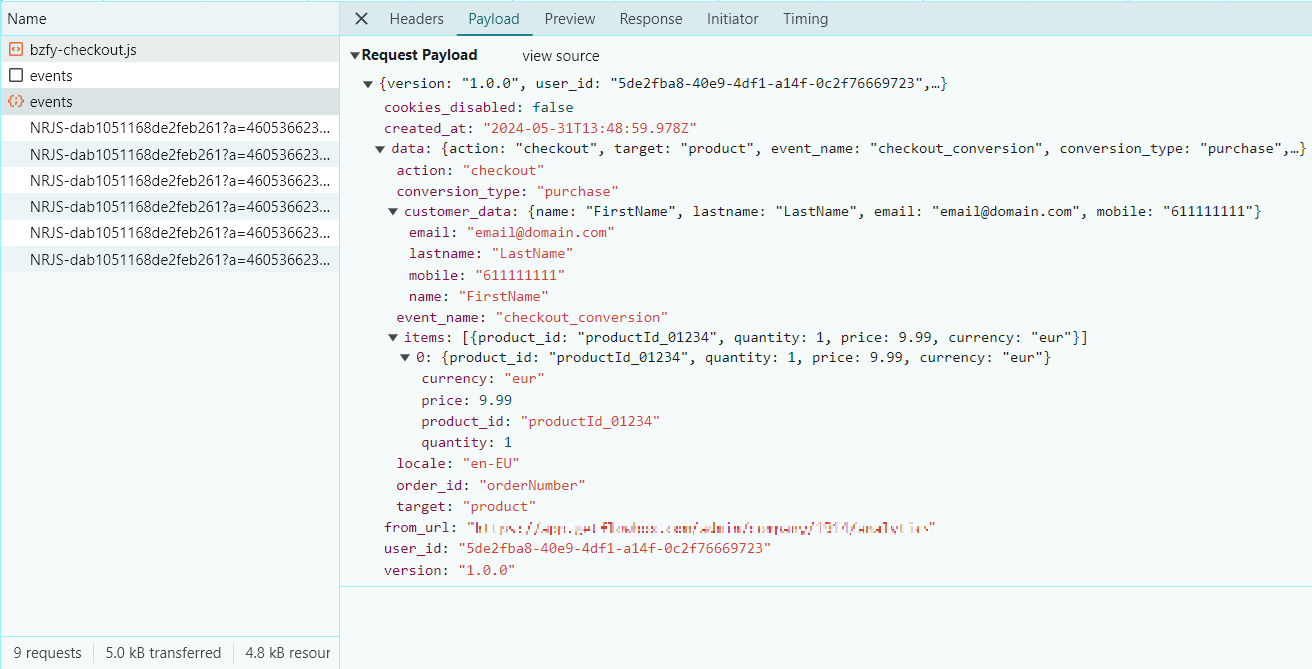 - Open the "events" request's Payload data and check that its "data > action" parameter is equal to "checkout" in order to ensure that it matches the Checkout script. If not, it could have been generated by a different Flowbox event (such as "embed_viewed").