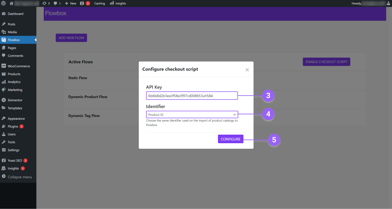 - In the popup window, add your Flowbox API key.