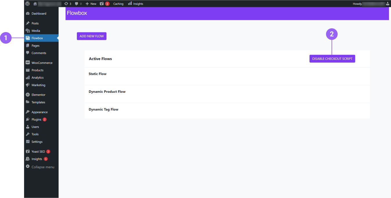 You can enable or disable the Checkout script anytime from your Flowbox plugin admin page.