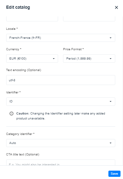 - Add the identifier that you use in your product catalog. Make sure to choose the same identifier used on the import of your product catalogs to Flowbox.