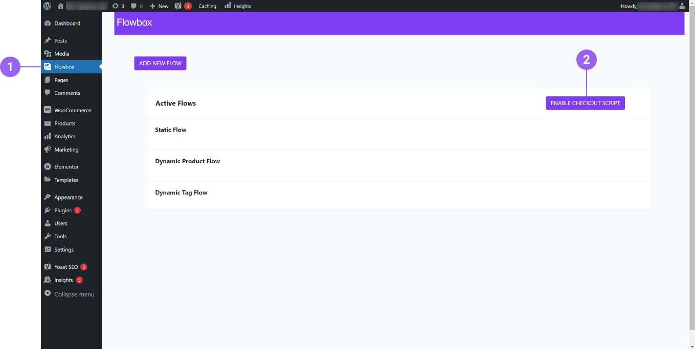 Using our Flowbox plugin for WordPress with WooCommerce, you can enable the Checkout script on your WordPress website with only one click.